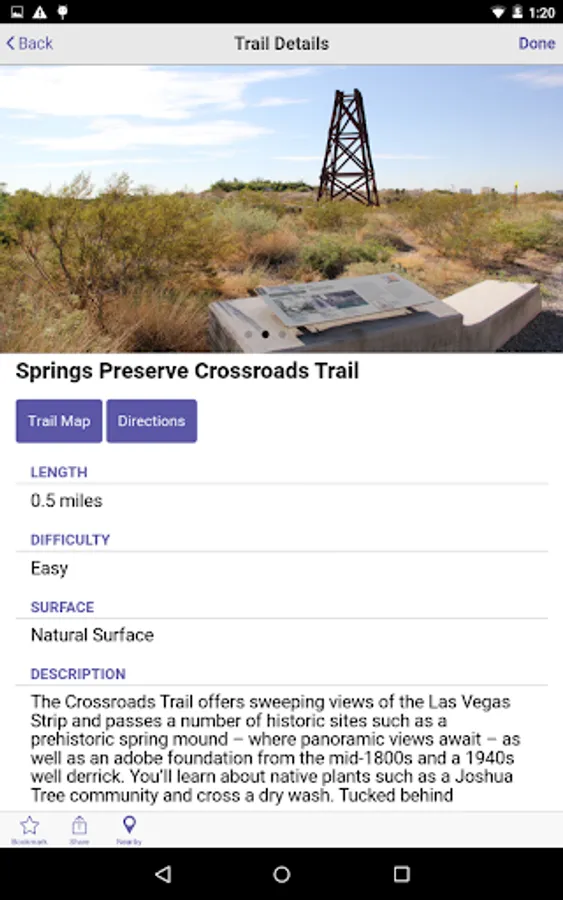 Find all walking, hiking, biking and horse trails in Southern Nevada. With options to customize a search, anyone can locate a trail that is just right for them. Search for trails based on your current location, amenities, level of difficulty and more. Detailed information about each trail is provided as well as beautiful photos. This app includes a book mark feature to save your favorite trails for future reference.