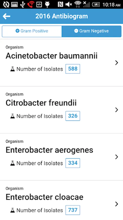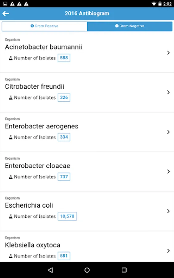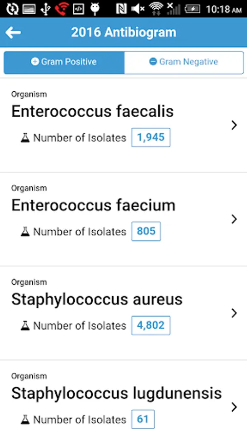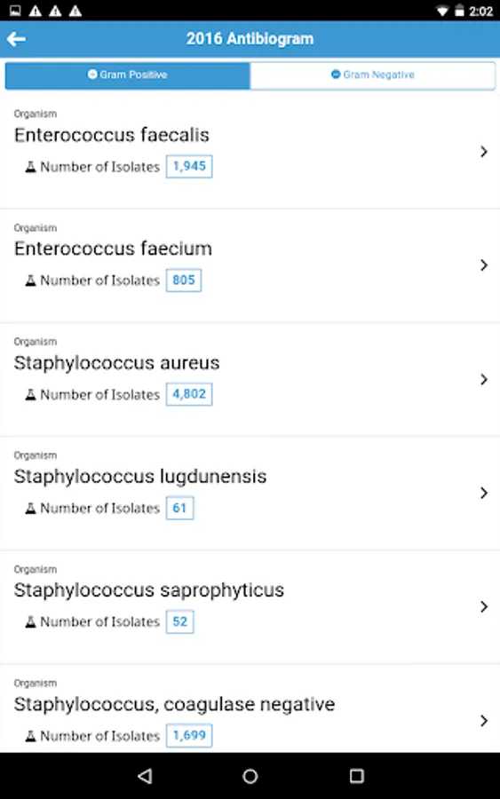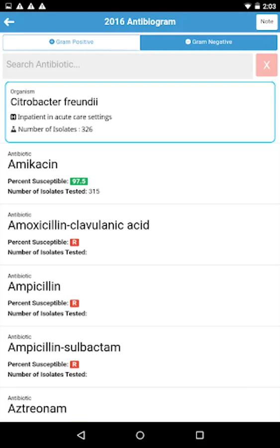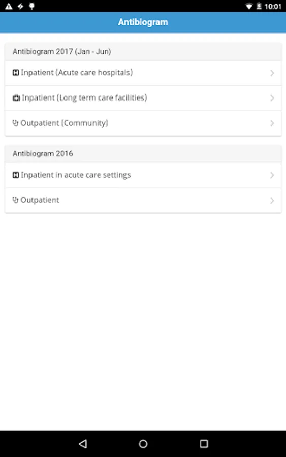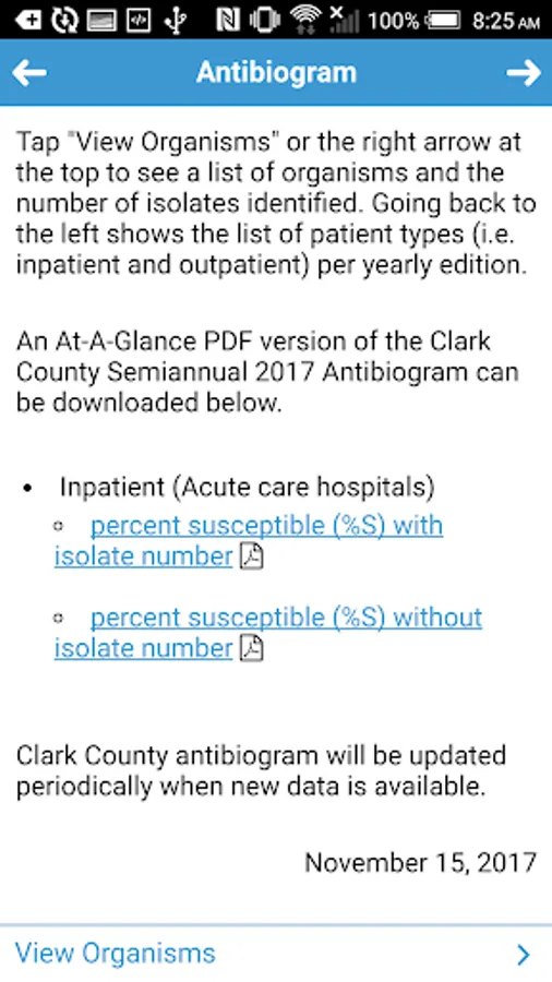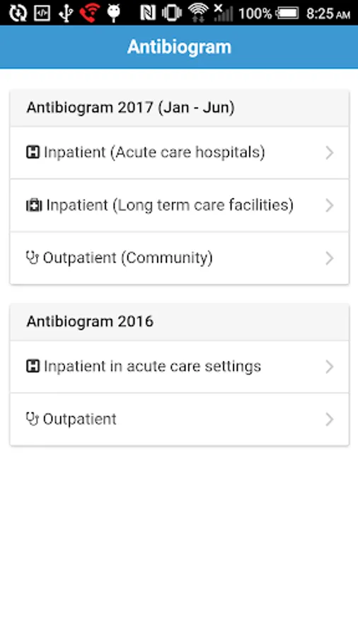 There are two types of antibiogram: Hospital Inpatient and Community Outpatient. Both types of antibiogram can be viewed in either At-A-Glance PDF version or antibiogram of individual organism web version.
