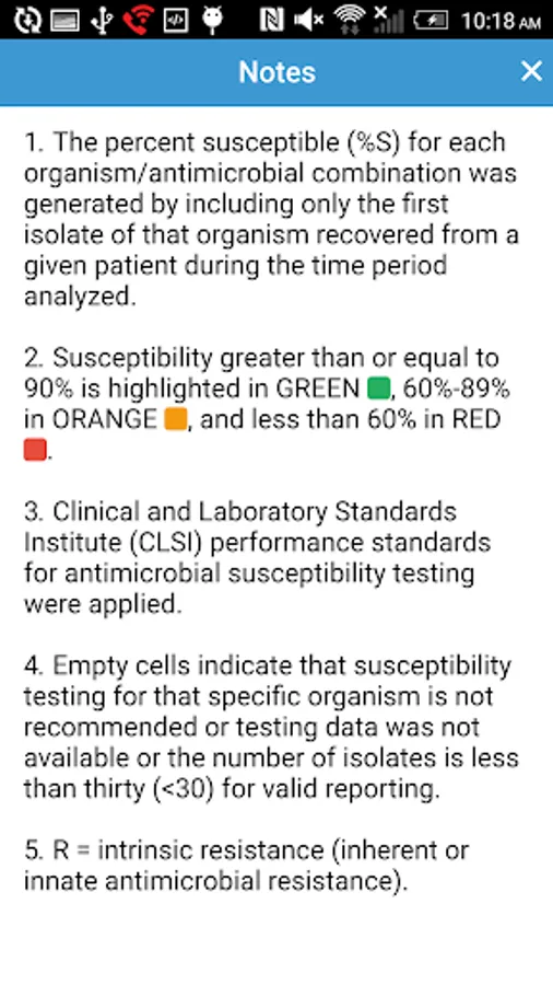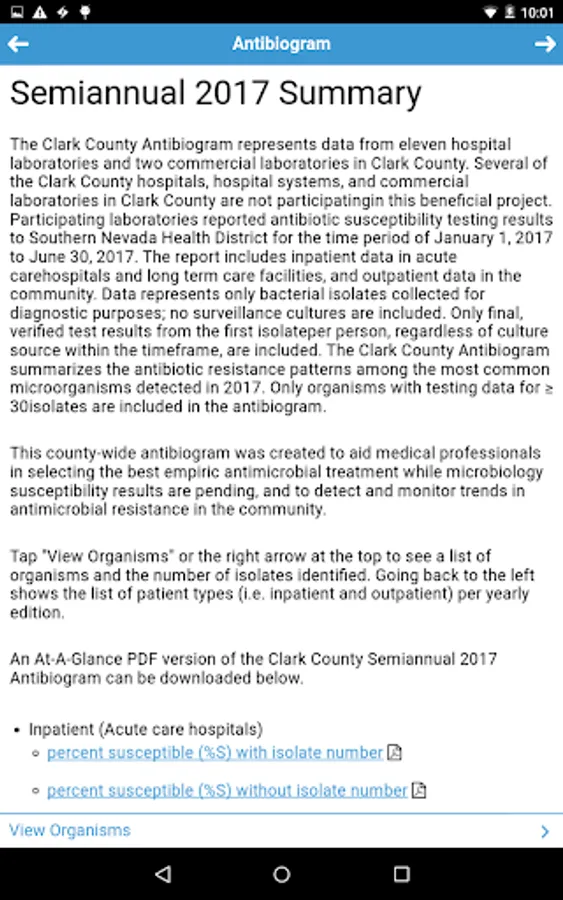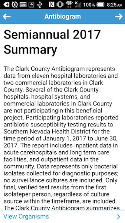 The Clark County Antibiogram represents data from participating local hospital and commercial laboratories in Clark County. Participating laboratories report antibiotic susceptibility testing results to Southern Nevada Health District for the time period of 6 months, twice a year. The report includes inpatient and outpatient data. Data represents only bacterial isolates collected for diagnostic purposes; no surveillance cultures are included. Only final, verified test results from the first isolate per person, regardless of culture source within the timeframe, are included. The Clark County Antibiogram summarizes the antibiotic resistance patterns among the most common microorganisms detected. Only organisms with testing data for ≥ 30 isolates are included in the antibiogram.