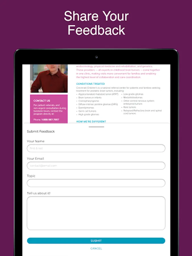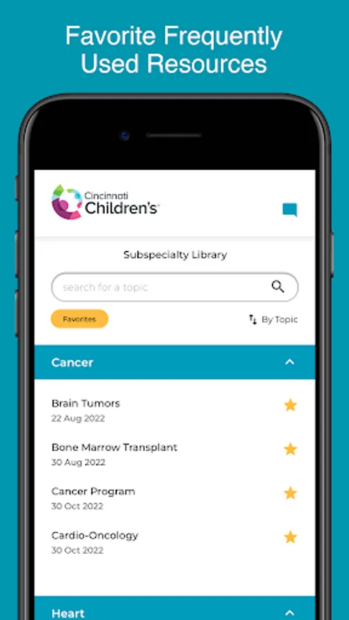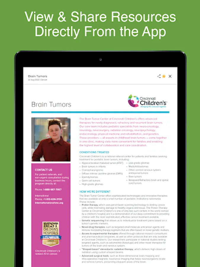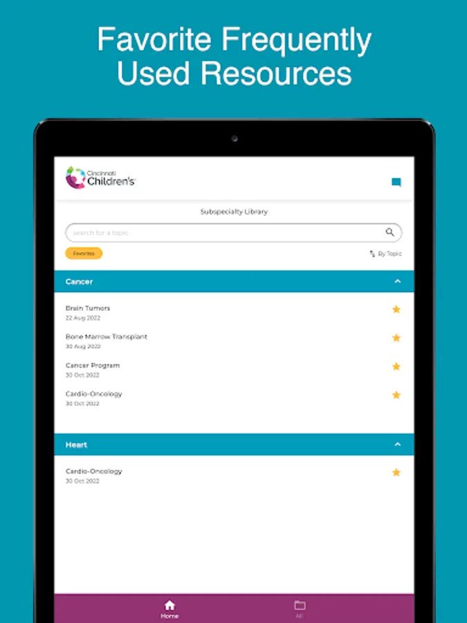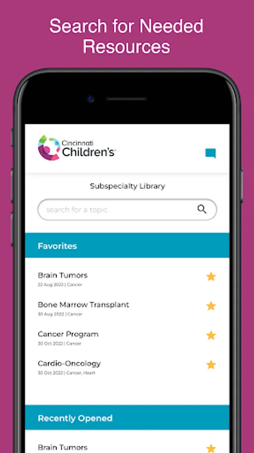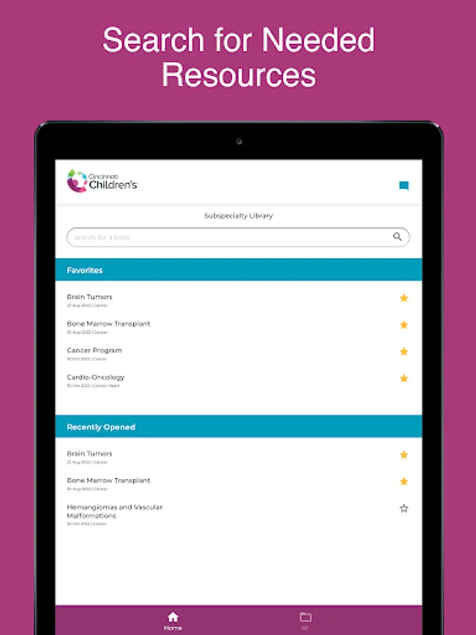 Pediatric subspecialist references. Each link opens information on Cincinnati Children's divisions and programs. The app is designed to be clean and efficient for use by pediatric specialists.