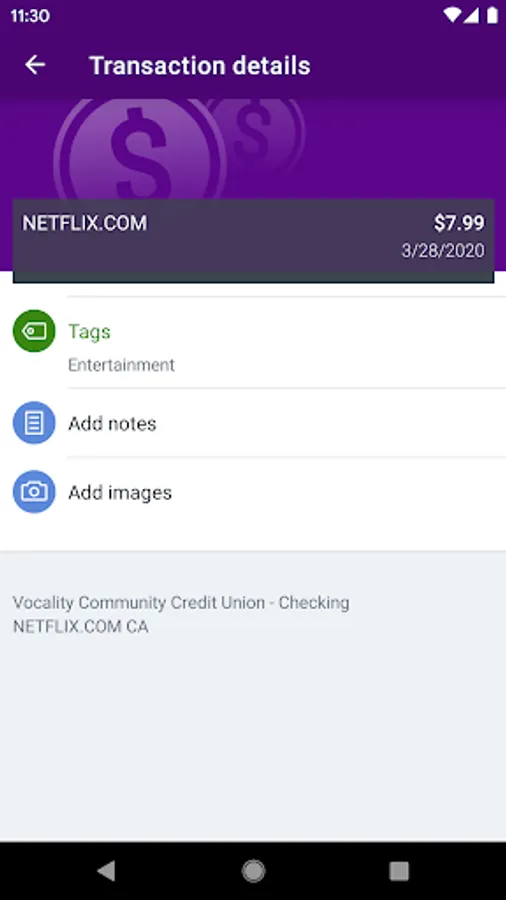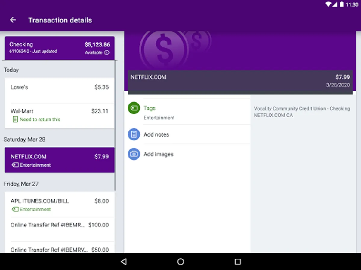 • Keep your transactions organized by allowing you to add tags, notes and photos of receipts and checks.