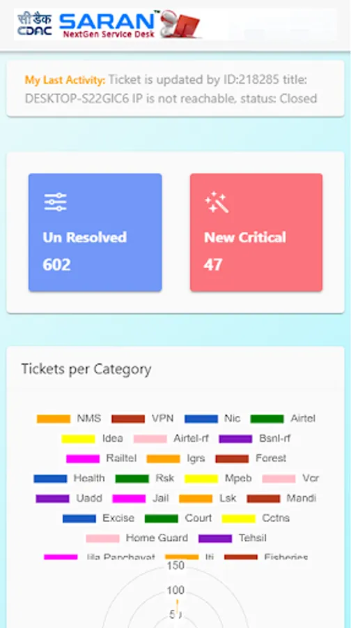SARAN is a web based Service Desk software designed and developed by CDAC Thiruvananthapuram. It provides a completely customizable platform with automation support that helps organizations achieve better and productive collaboration among customers and service support teams. The comprehensive feature set and graphical rich dashboards help to get better