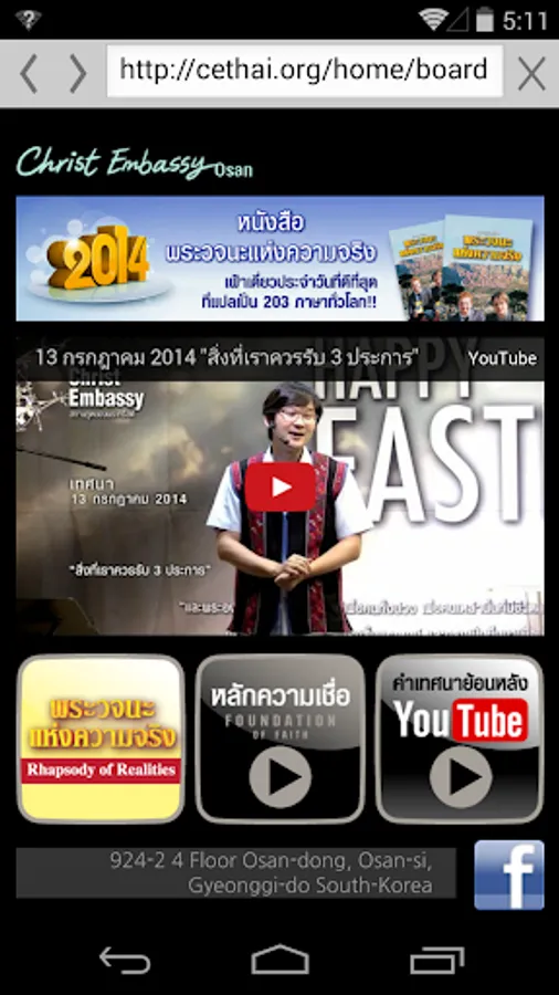 매주 일 실시간 영상 예배 와 지난 설교 들 그리고 200 여개 의 언어 로 번역 된 세계적인 묵상집 인 '말씀 의 실재' 태국어 버전 을 매일 마다 공급 받을 수 있습니다.