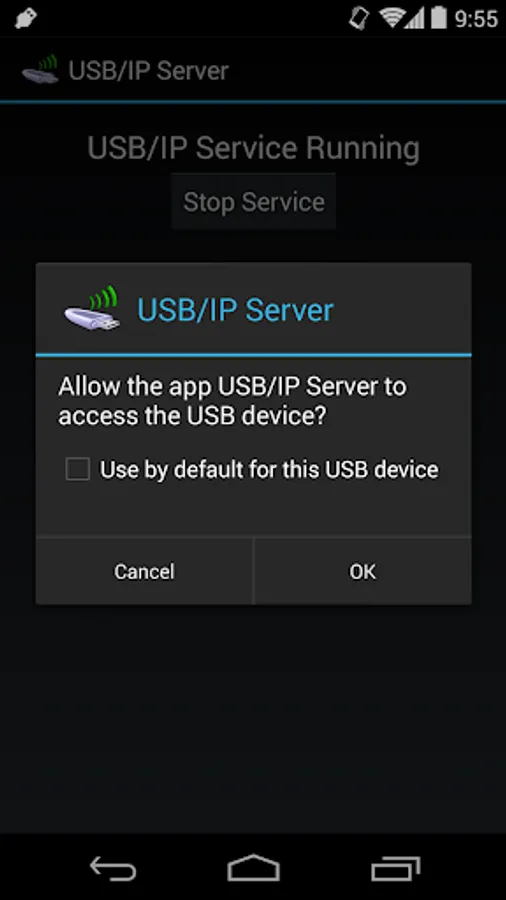 With the app's USB/IP service running, you will be able to list USB devices connected to your Android device from your PC using the usbip utility. When you try to attach to them from your PC, the USB permission dialog will be displayed on your Android device. After you accept the permission dialog, the device will attach to your PC.