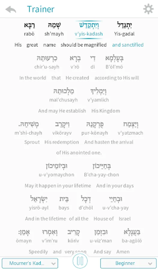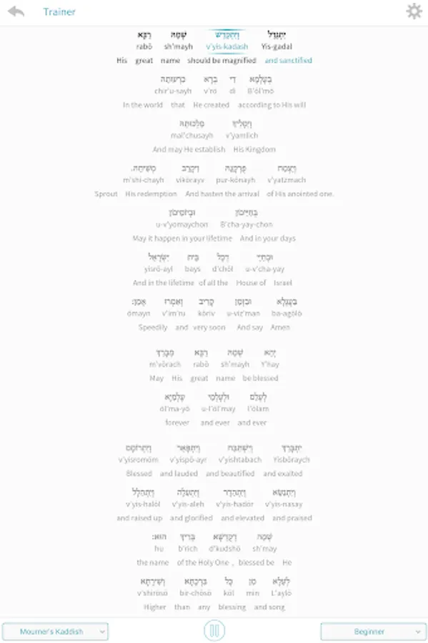 Kaddish Assistant helps you learn how to say Kaddish at your own pace and in your own tradition. Read along as each word of the Kaddish is recited and highlighted. Learn how to properly pronounce each word, using either Hebrew or transliteration. And understand what each word means with integrated translations.