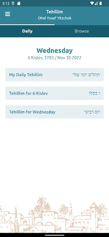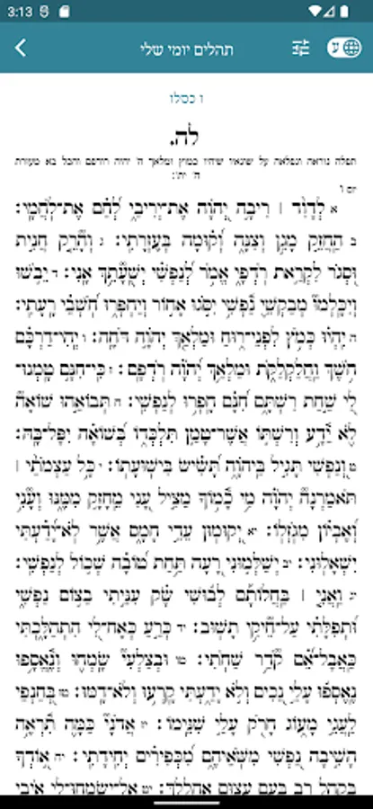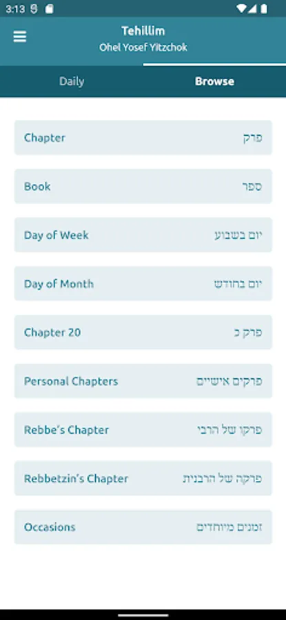 • Browse the Tehillim using preset shortcuts, including by chapter, book, day of the week and day of the month (you can select based on the Jewish and Civil calendars).
