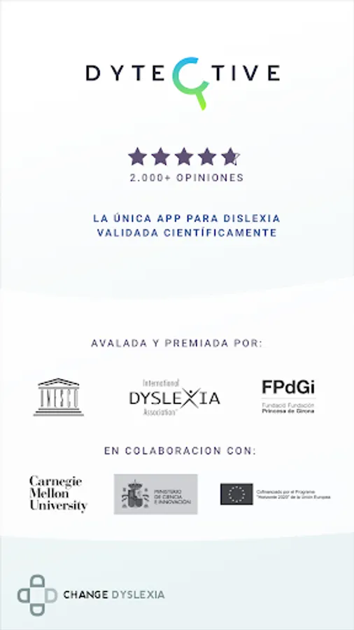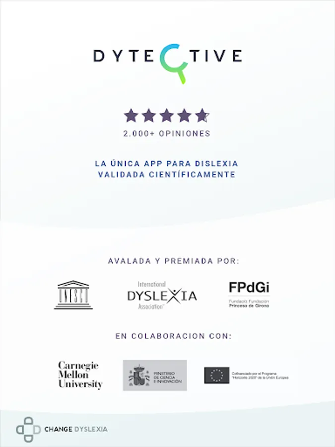 - For schools: thanks to Dytective you will offer a differential, cutting-edge and scientifically validated solution, eliminating school failure due to reading-writing difficulties. You will optimize the resources of your center thanks to the automatic personalization of the exercises and the automatic generation of reports. Join our scientific community and recognized by prestigious awards. Enter and enjoy our 12-month licenses per student.