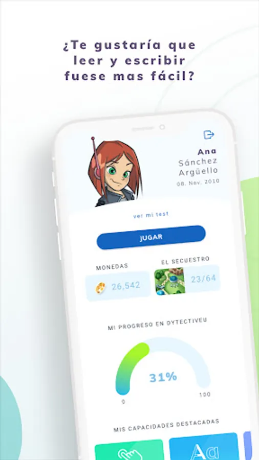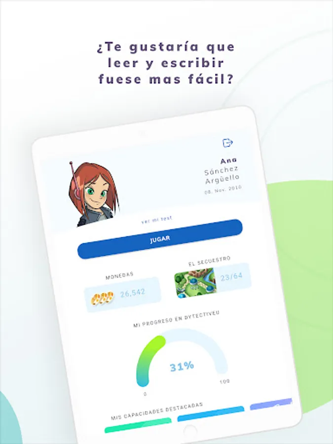 With DytectiveU you will improve your reading and writing skills while having fun playing: 42,000 games are personalized taking into account your strengths and weaknesses so that you improve yourself day by day. Each DytectiveU challenge or session lasts 10-20 minutes. Remember that it is very important that you use DytectiveU systematically, doing 4 challenges or weekly challenges, so you can see incredible improvements in your reading and writing skills.