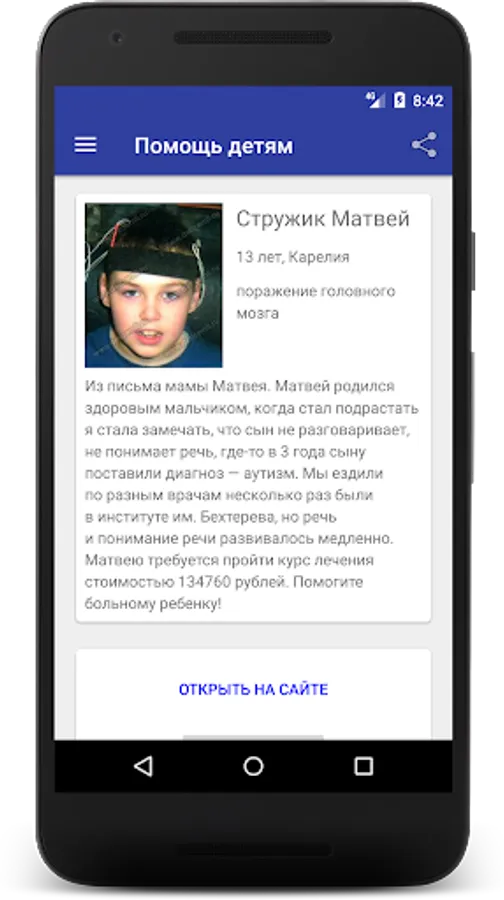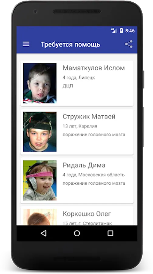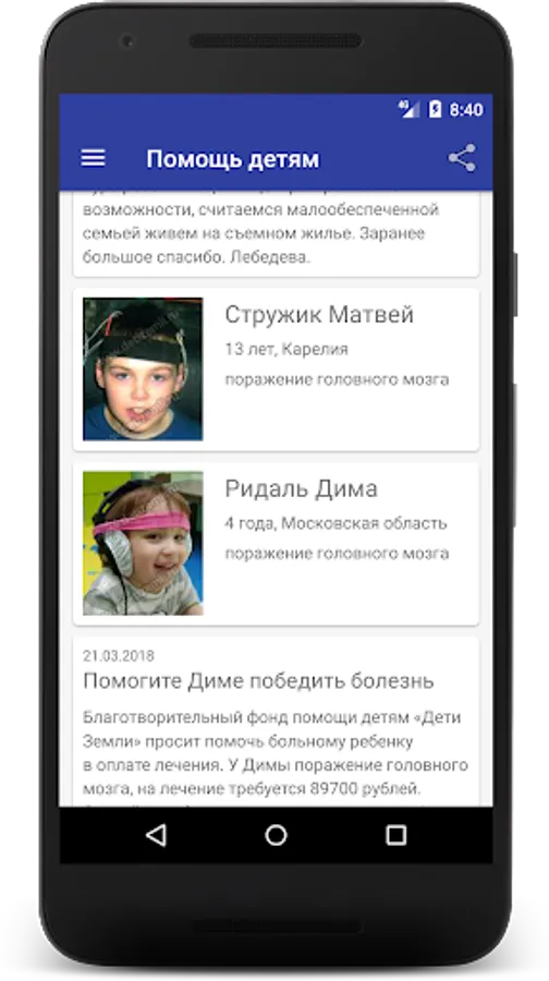 After downloading the application, you'll always be up to date with news and the needs of the charitable organizations involved in the work of our project. Each user of the application will be notified as new sick children who need help. Using our app, you can easily help the sick children participate in volunteer projects, be aware of the good things!
