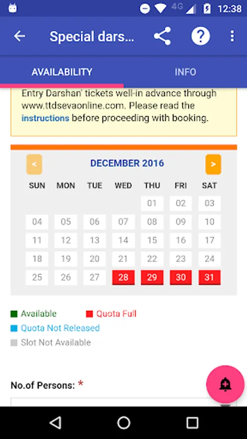 Setup alert in this app and Garuda will notify you whenever Darshan/Accommodation/Seva tickets are available.