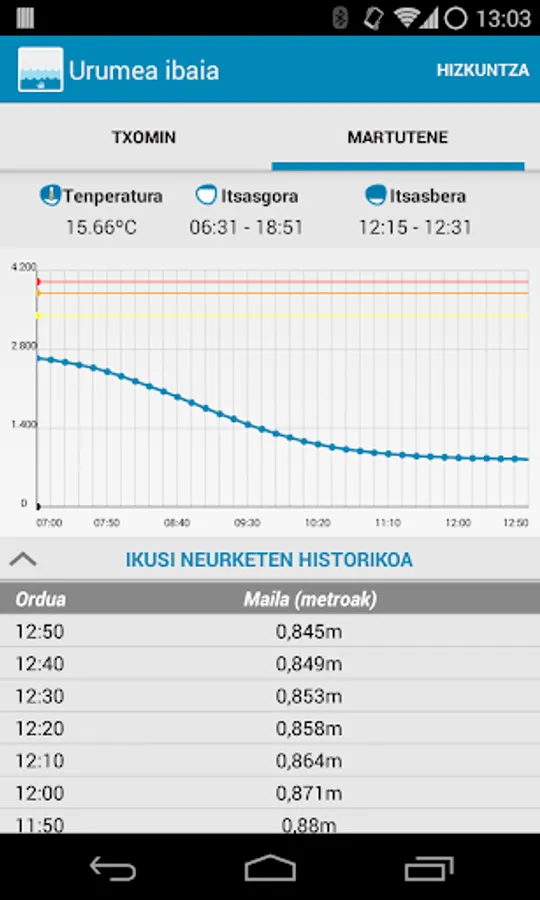 The application lets you view the current river levels to step through these two points, time and tide graph that allows the evolution of the water level in the last hours. If the river elevation exceeds some noteworthy that information appears on the top of the application
