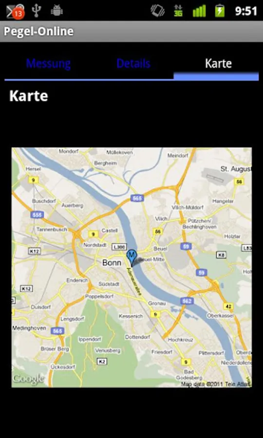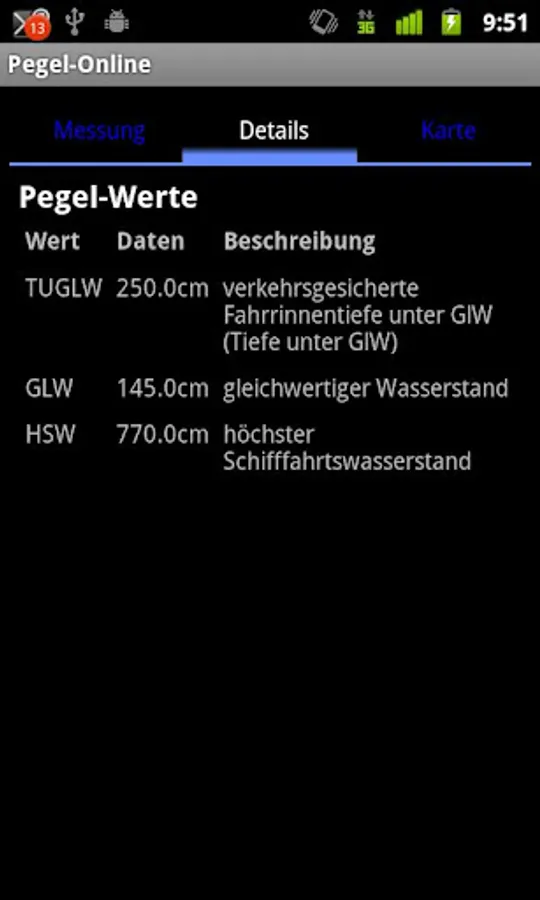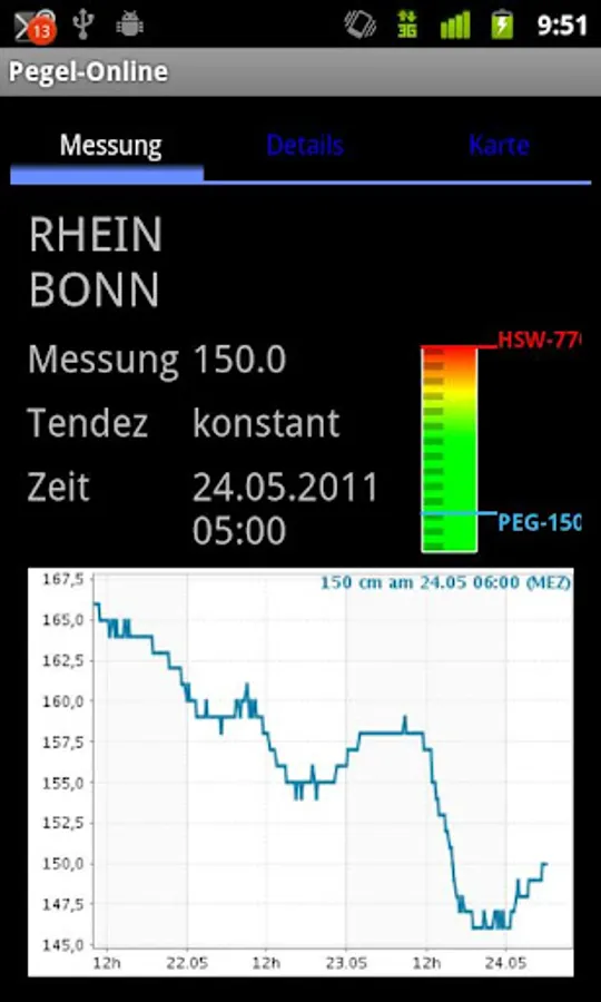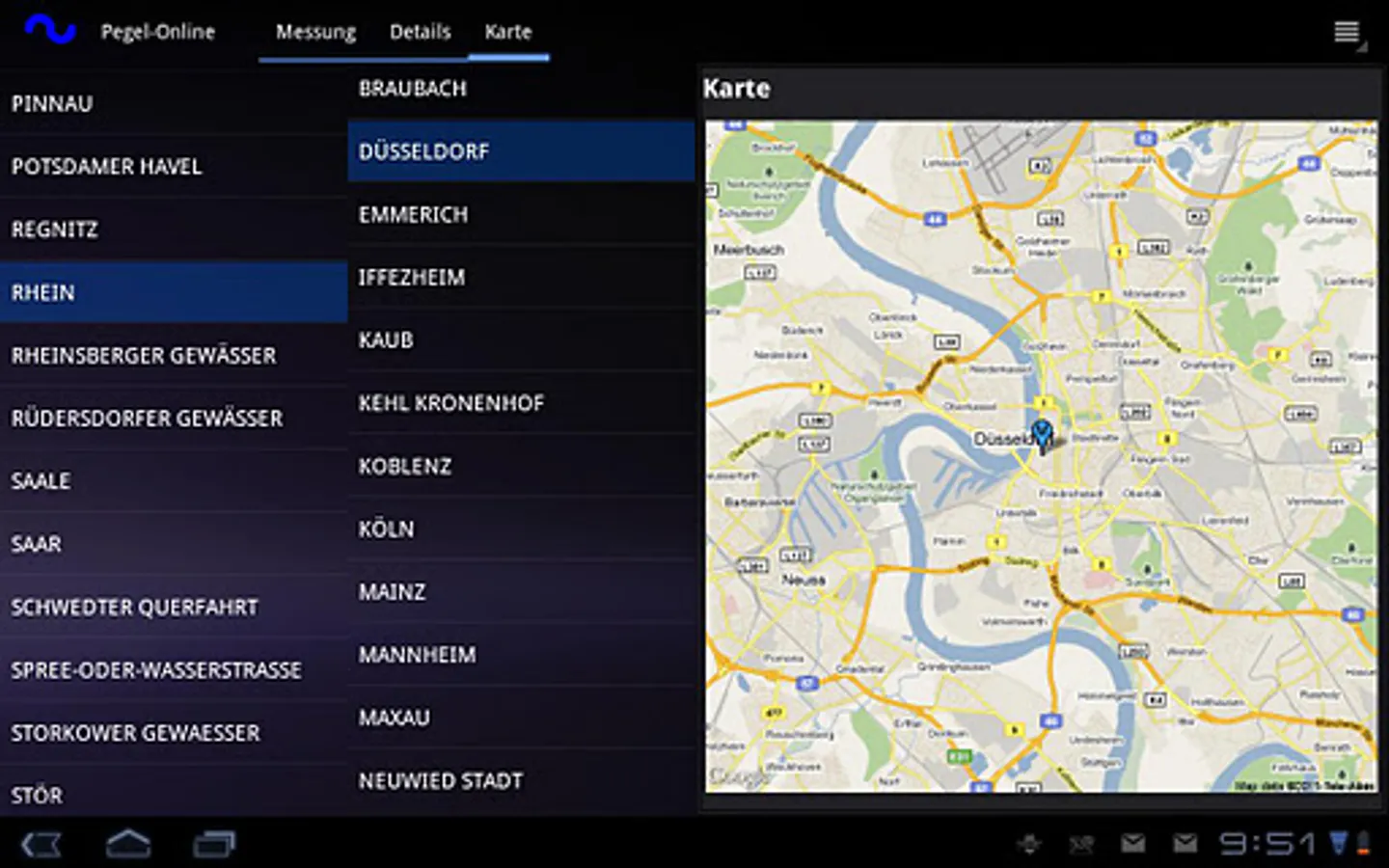 Displays data from over 400 measure points regarding the tide of river in Germany, for exmple Rhein, Mosel, Oder, Main etc. based on the data from www.pegelonline.wsv.de