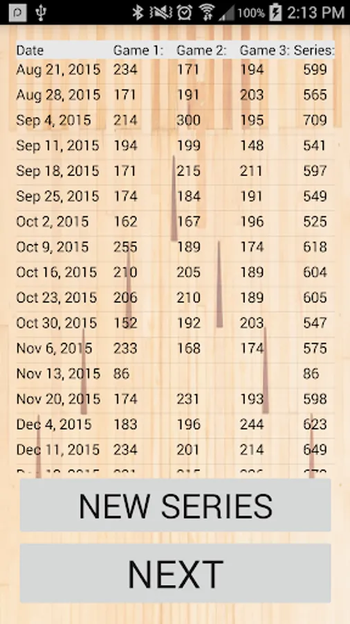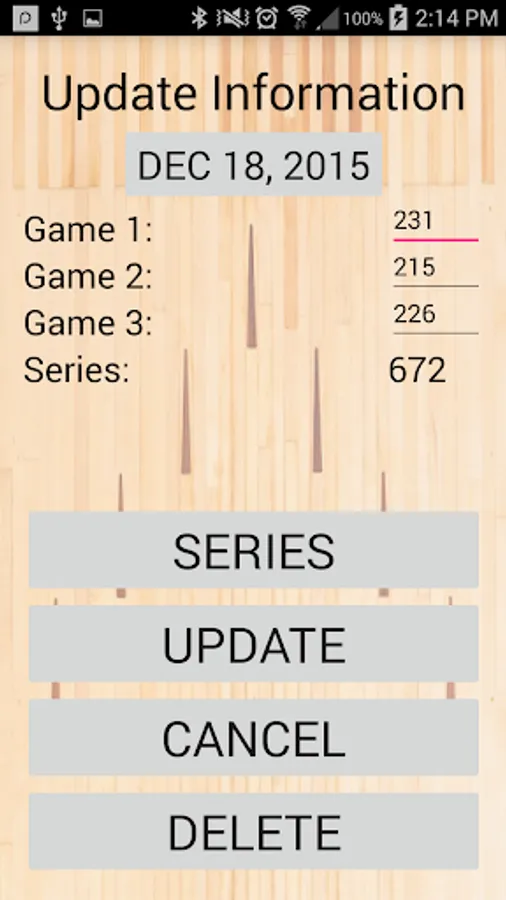 On the New Series screen you can choose the date and enter your scores, after you enter your scores click the "Series" button to get a total of your scores (you have to click this button so that the database can see your total score). Once you do that hit the "Next" button and that will take you back to the Scores page and it will show the data you entered.