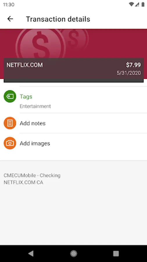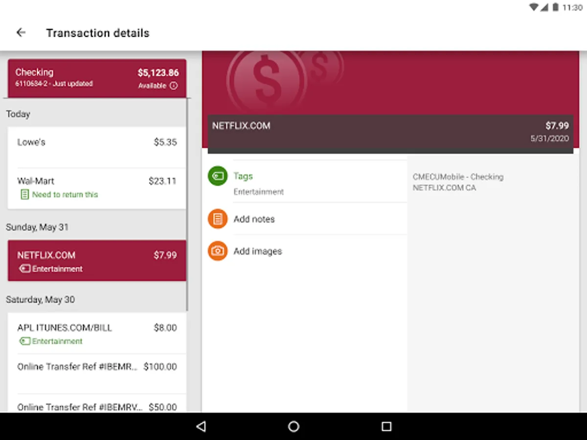 Add Tags, Notes, Images & Geo-Information: By enhancing transactions with custom tags, notes or photos of a receipt or check, you have the ability to stay organized and find exactly what you’re looking for when searching through your finances.