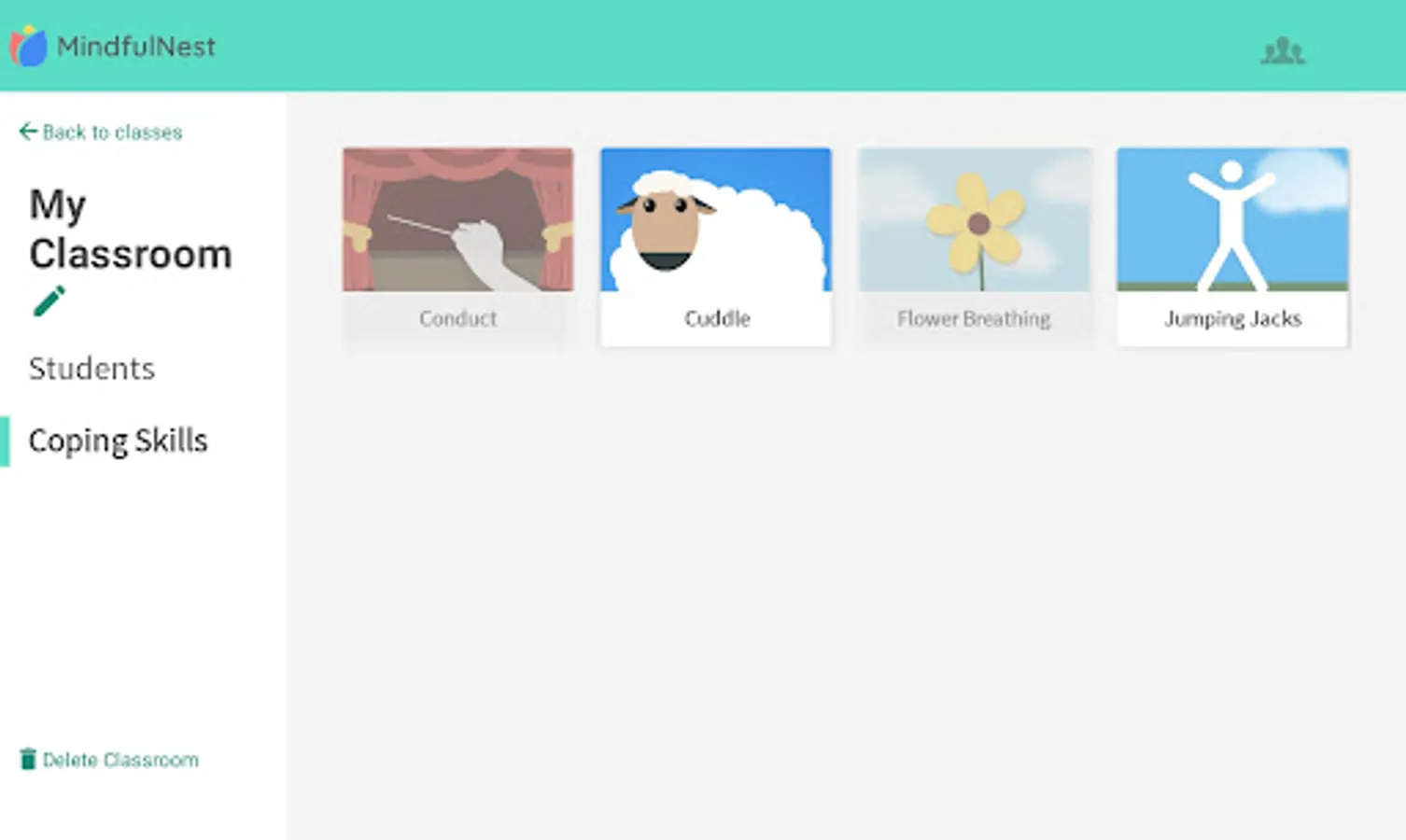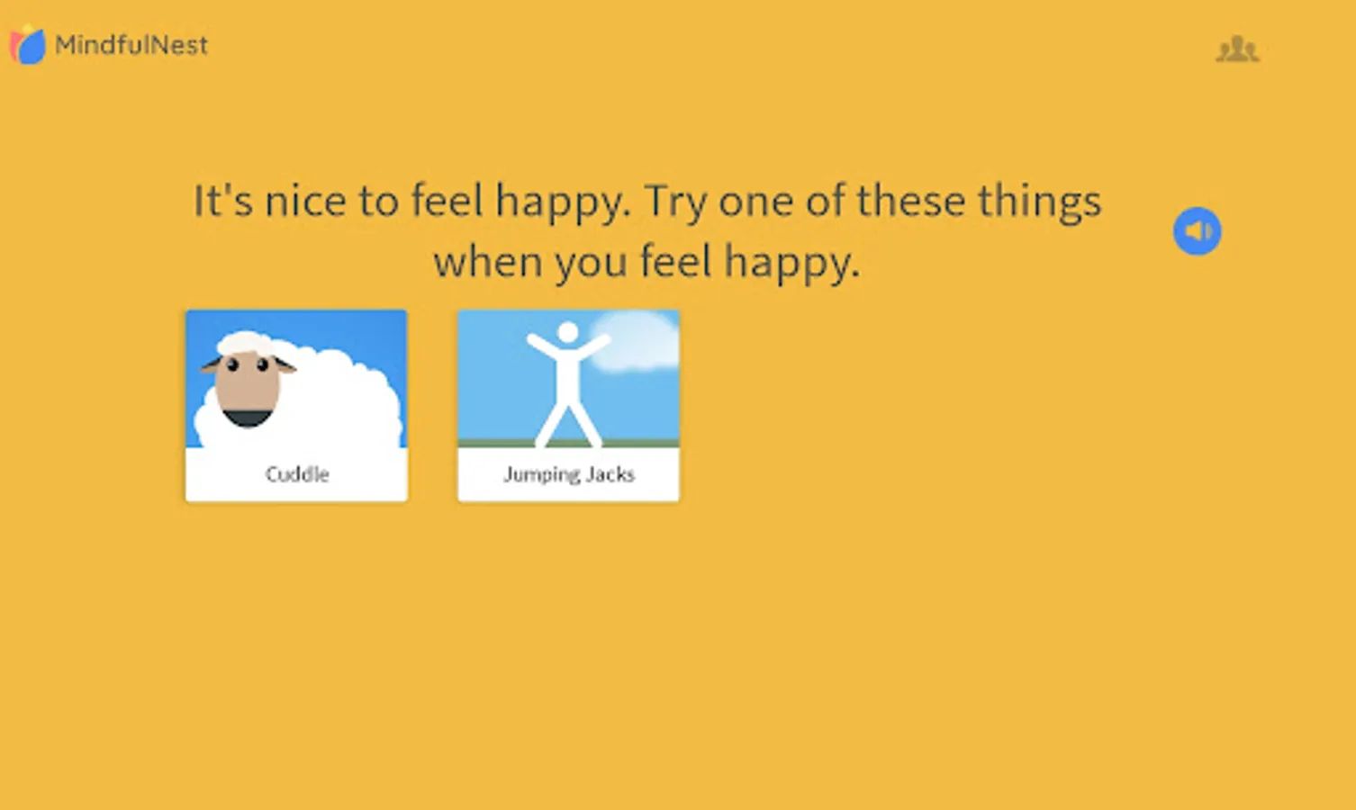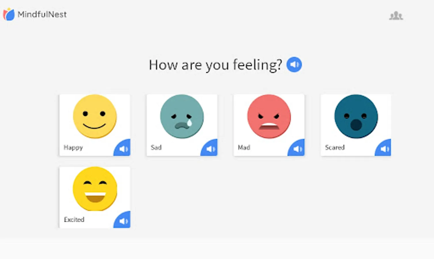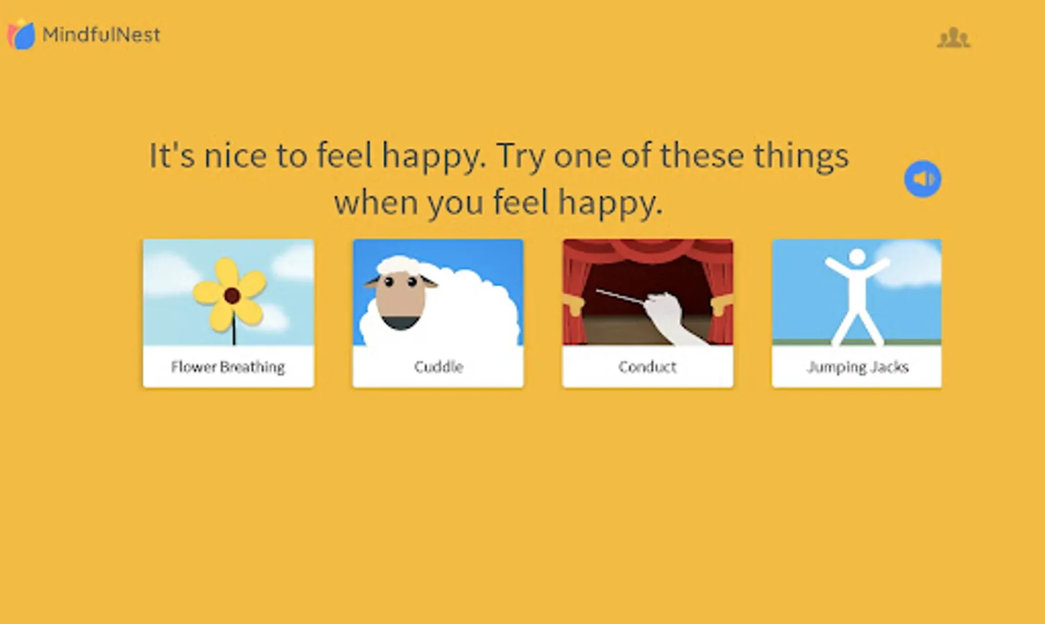 The MindfulNest app is designed to guide children through activities that help them calm and control their emotions. Handheld devices enable the children to interact with the app. For example students can try guided breathing with a flower that lights up when they breathe. Other example activities include guided stretching or conducting music.