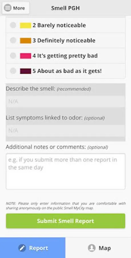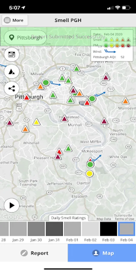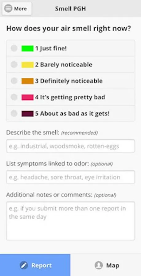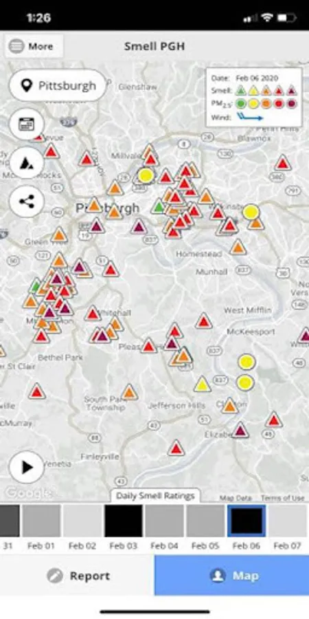 Smell Pittsburgh is a mobile phone app designed to engage Pittsburgh residents in tracking pollution odors across our region. The app also includes a map-view showing smell reports submitted in the area on a given date. This allows residents to track where odors are frequently concentrated, and link those smell events to poor air quality in, or upwind from, those areas.