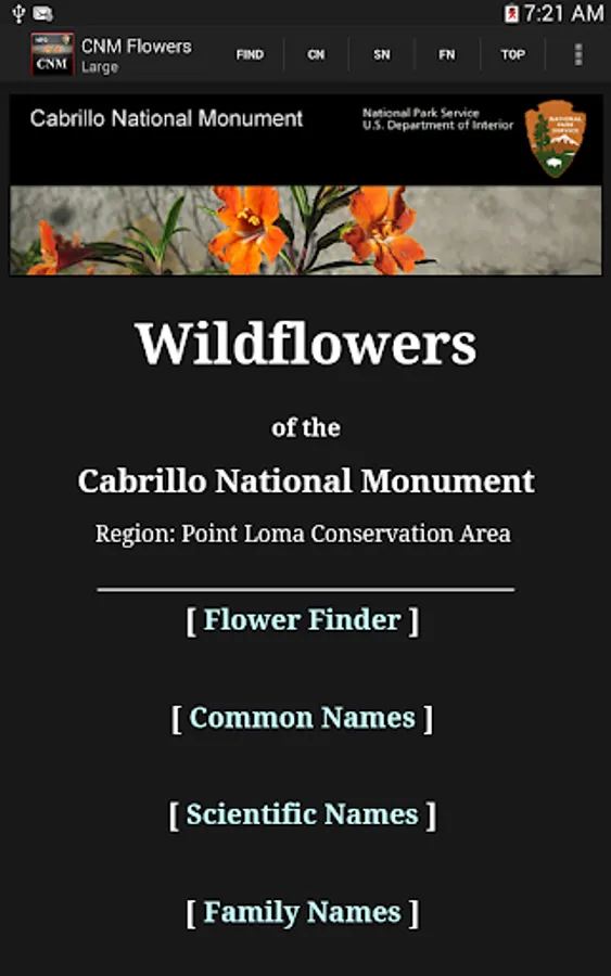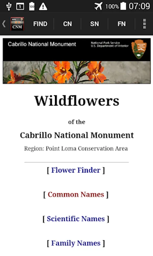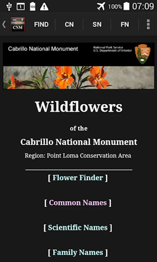 The National Park Service invites you to take along a virtual botanist the next time you visit the Cabrillo National Monument. With almost 350 plants and 2500 photos, this App offers both novice and advanced wildflower enthusiasts the opportunity to identify common and rare plants while exploring remote areas of the Cabrillo National Monument.