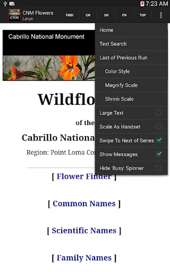The App is based off of the website “Wildflowers of the Cabrillo National Monument” An easy way to experience the content of the App before deciding to download is to visit the online version at http://www.cnmflowers.org/mobile