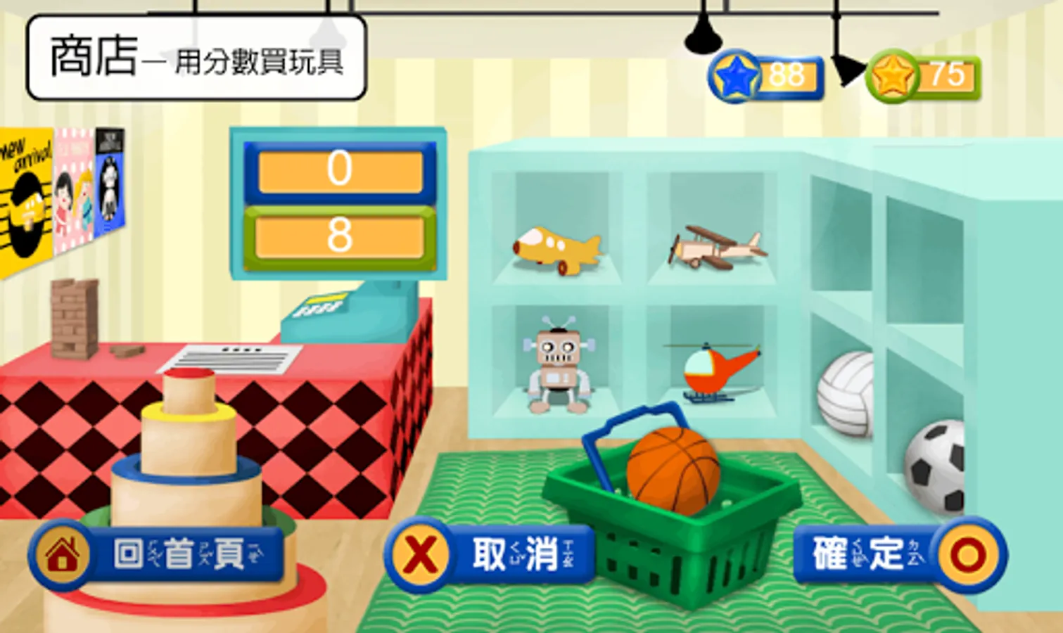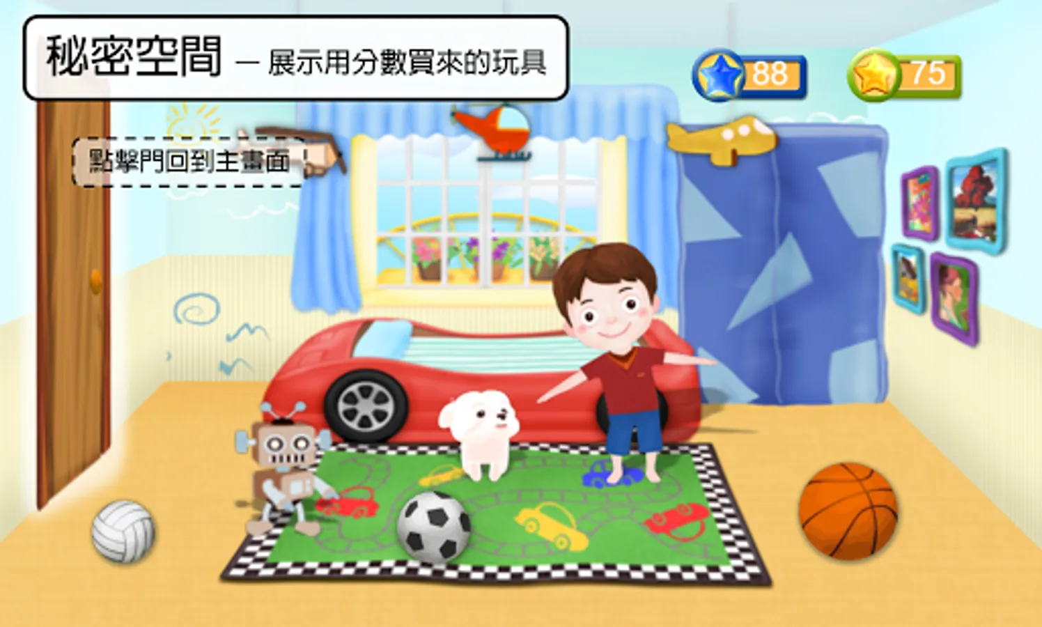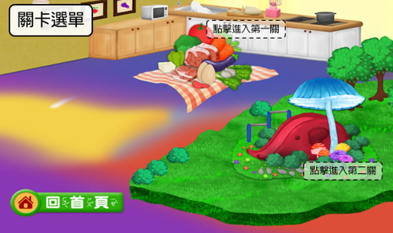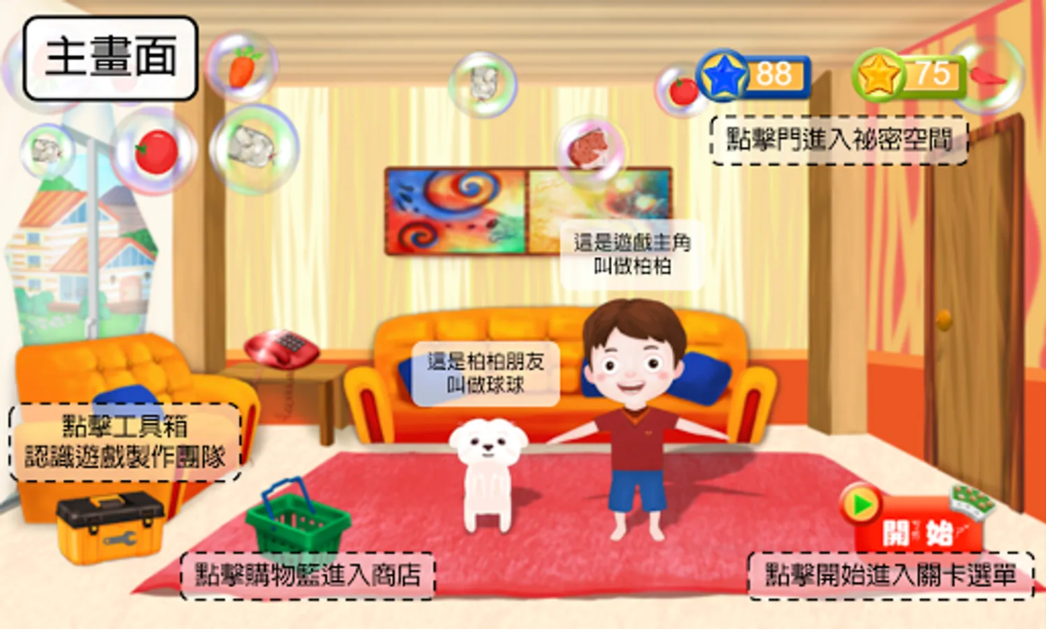 測試項目: 遊戲第一關(廚房)、遊戲第二關(室外)、遊戲商店(在主畫面點擊購物籃可進入)、遊戲秘密空間(在主畫面點擊門可進入)