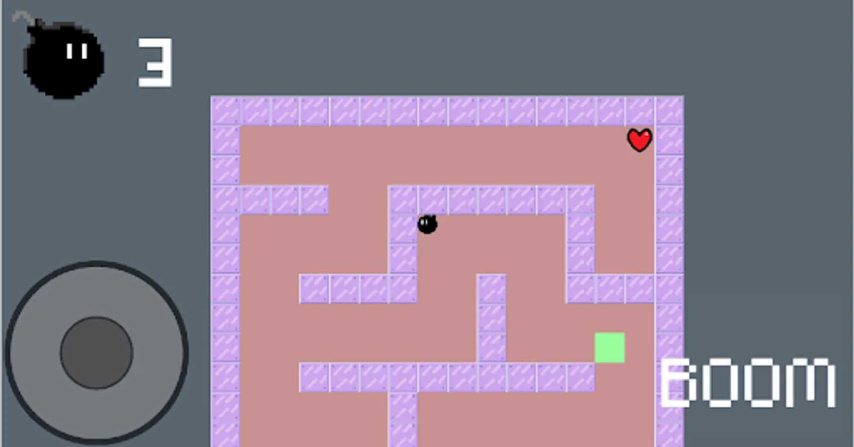 you are a bomb that must solve the labyrinth looking for the green zone, you can explode to break the walls but be careful, that takes your life