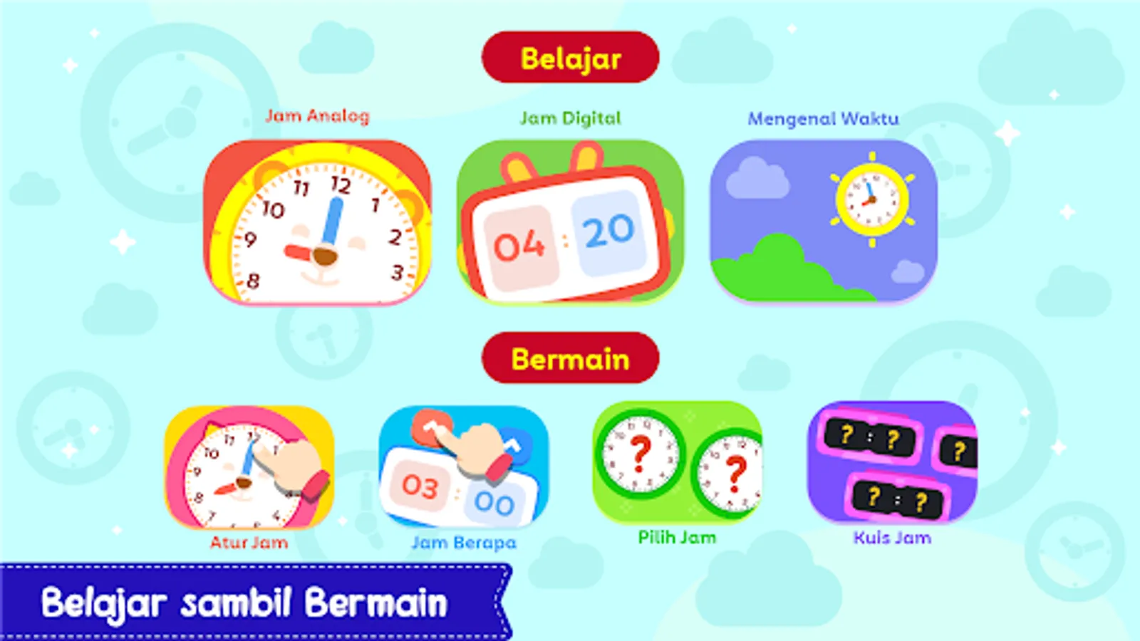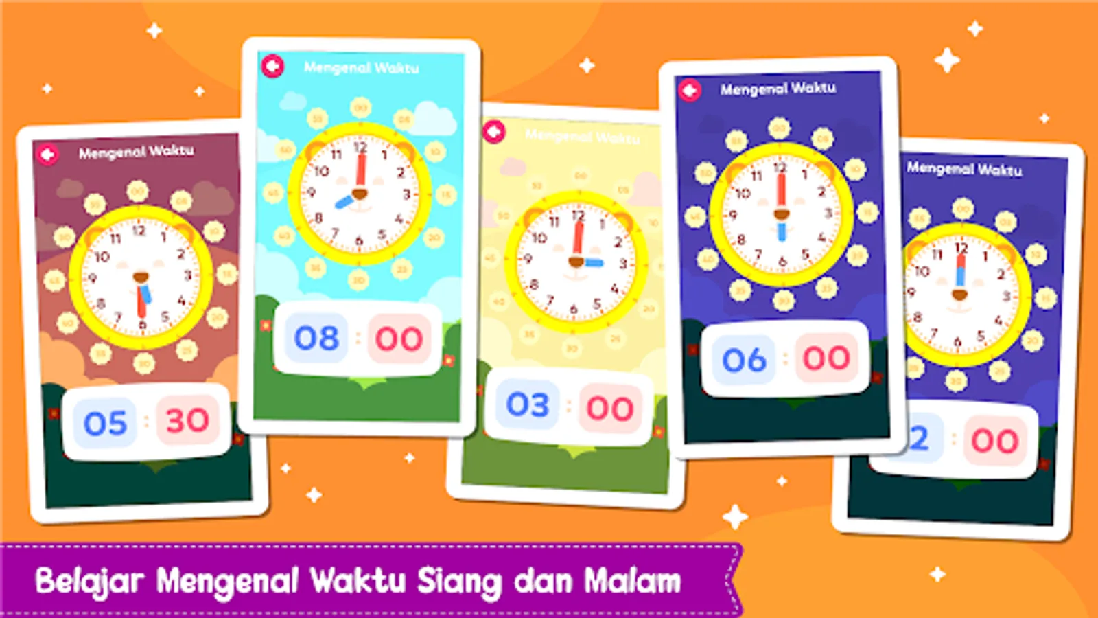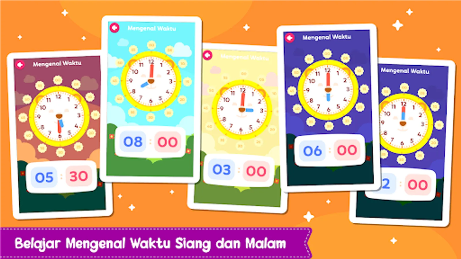 In this application children will learn to know what time it is. The learning concept in this application is designed interactively accompanied by interesting games and interesting sounds so that children don't get bored while playing and learning to know the clock and time.