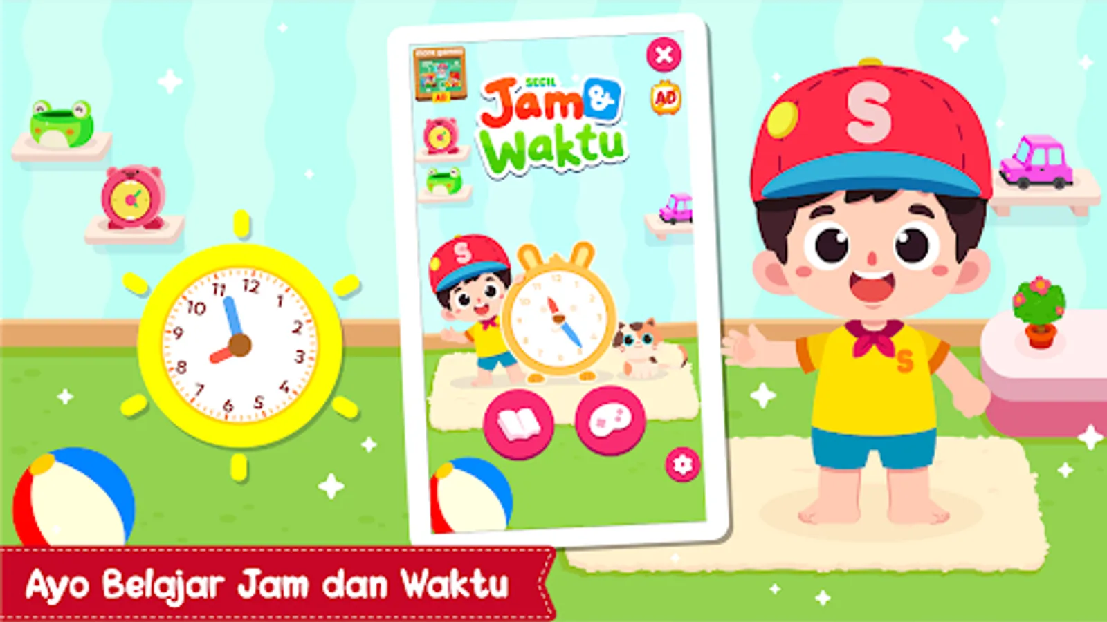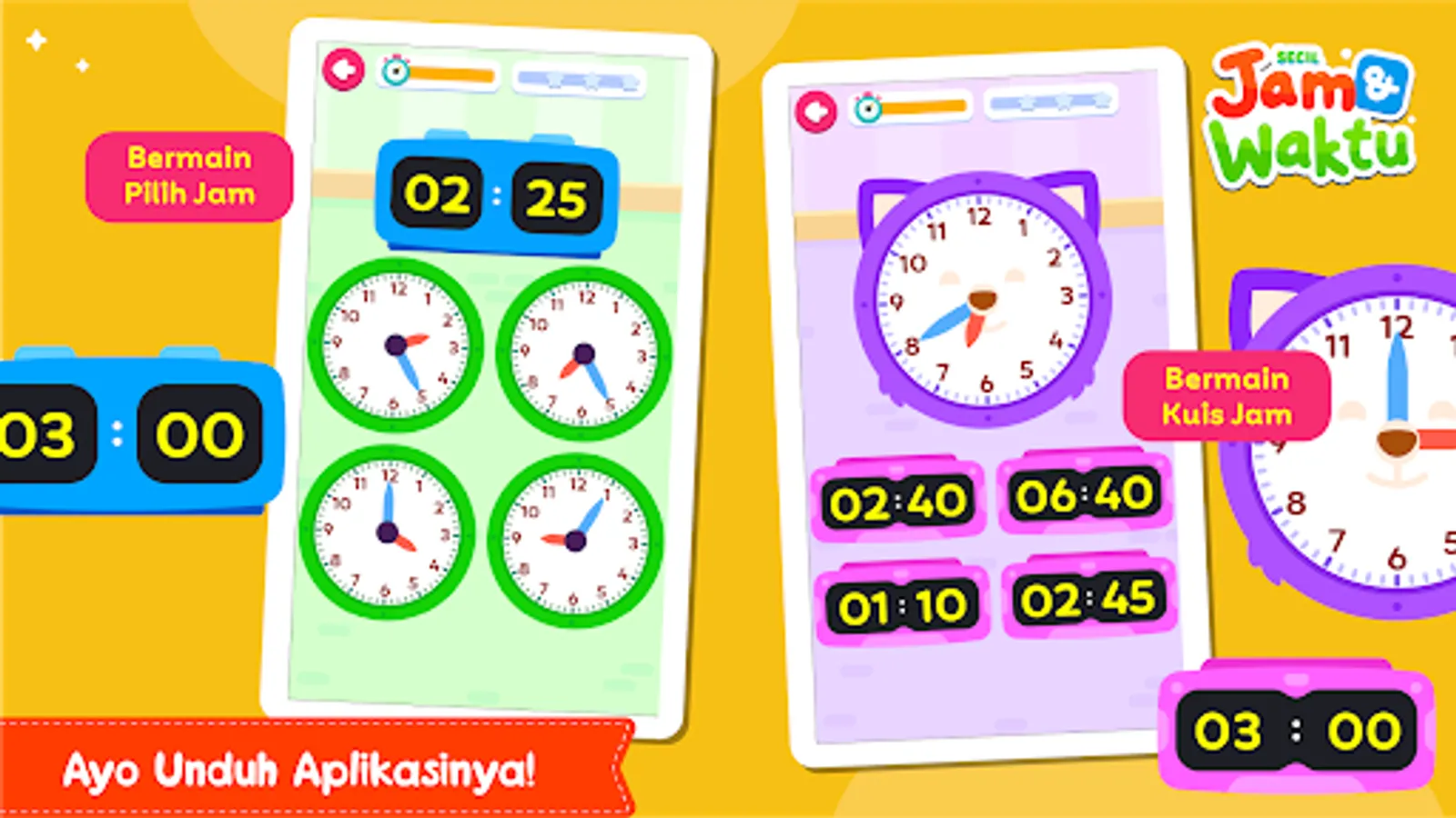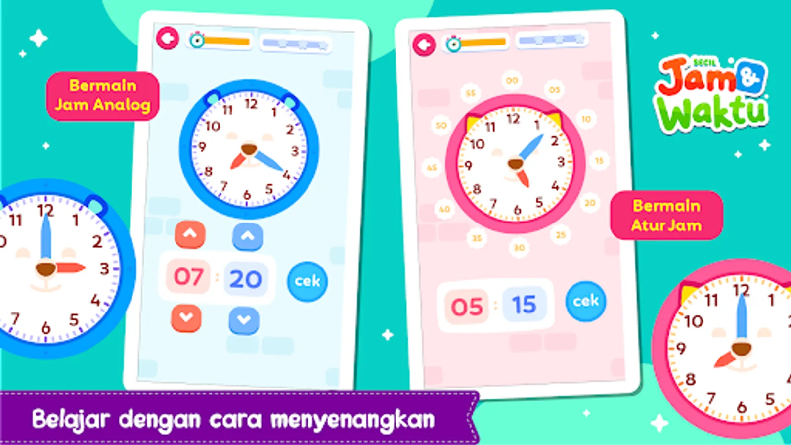 In this application children will learn to know what time it is. The learning concept in this application is designed interactively accompanied by interesting games and interesting sounds so that children don't get bored while playing and learning to know the clock and time.