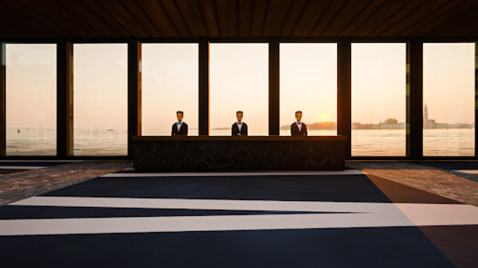 The sound of quiet waves, a balcony overlooking the sunset, the horizon stretching out across the whole window.