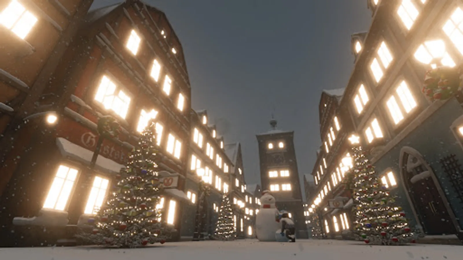 A Christmas market in a picturesque cityscape in the middle of winter.