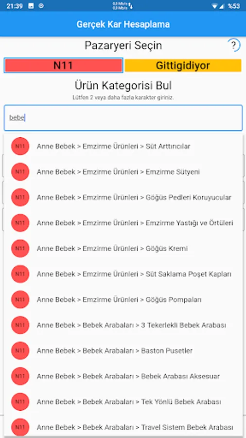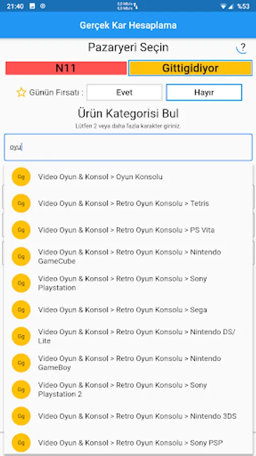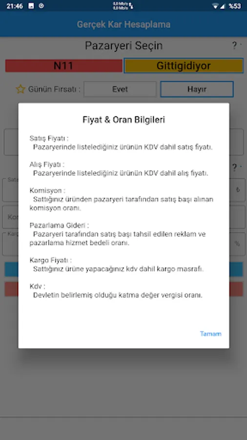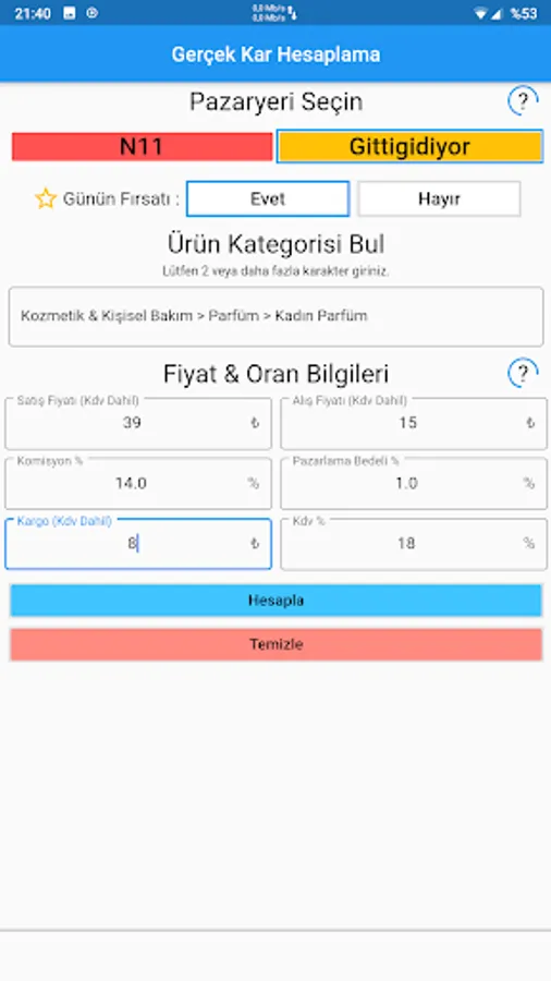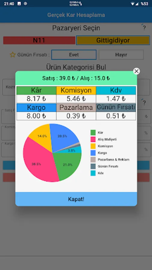 4- In the results table, the percentage of profit, commission, VAT, Cargo, Marketing Fee, Opportunity of the Day (for the gone) are accessed in YTL and on the chart according to the sales price.