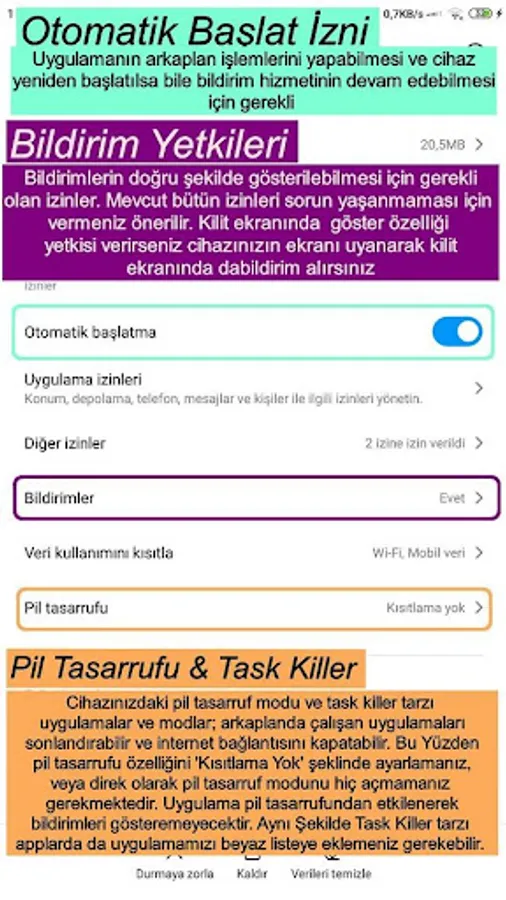 In order for the notifications to work, the application must be given permission to work in the background, display notifications, notification priority, permission to display on the lock screen, automatic restart, exemption from battery optimization. The application must be exempt from ram unpacking and task killer-style applications. The application should never be forcibly terminated by the user.