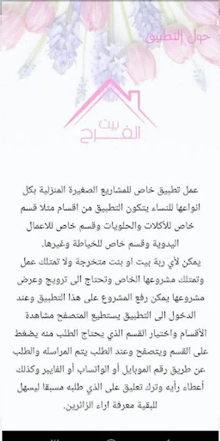 It is a special application for small household projects of all kinds for women. The application consists of sections, for example, a special section for food and sweets, a special section for manual work, and a special section for sewing and others. Any housewife girl graduate does not have work and owns her own business can house or need to promote and display its project can be lifted on this application and when access to the application browser can view sections and choose the partition that needs demand it presses the section surfs and upon request are messaging and demand by No. Mobile, WhatsApp or Viber, as well as give his opinion and leave a comment on what he requested in advance to facilitate the rest of the visitors' opinions.