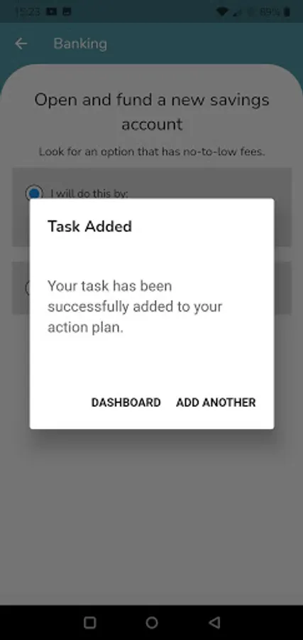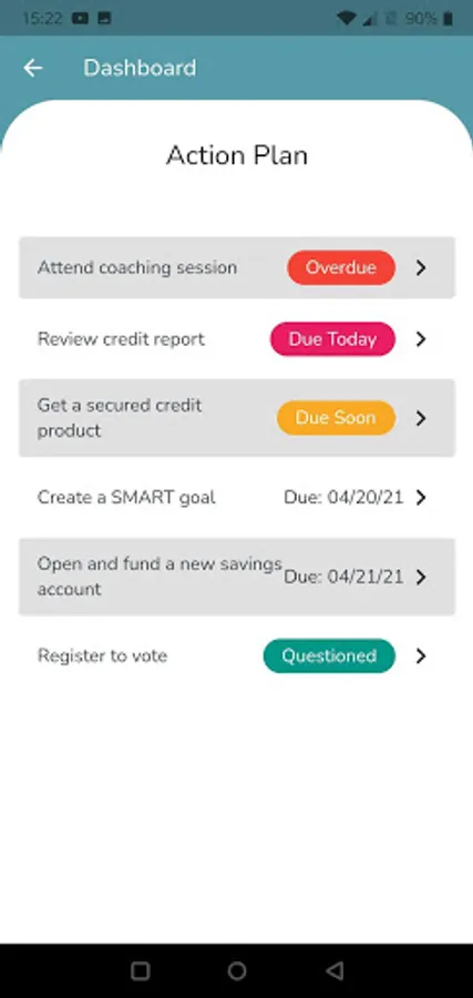 Create a personalized financial action plan by selecting tasks from financial categories, such as Goal Setting or Credit Building, and setting target dates you want to complete your task by. Ask your coach questions, track your progress, and celebrate your MoneyGoals!
