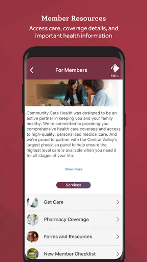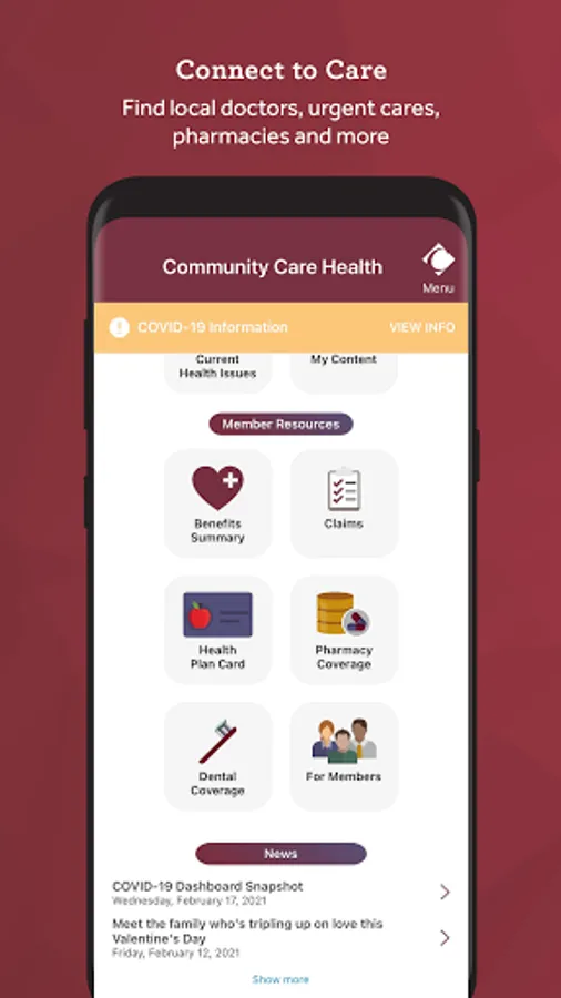 A mobile app for Community Care Health members! This provides access and information to claims, Community Medical Centers patient chart, and more.