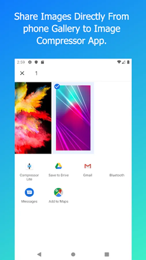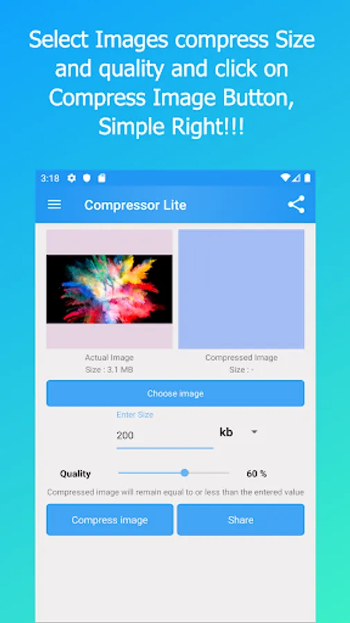 Compressor Lite - Compress Image Size app's main purpose is to compress, crop, resize images into a fixed size as per your requirement and also have the ability to share them to your email, social networking platform easily.