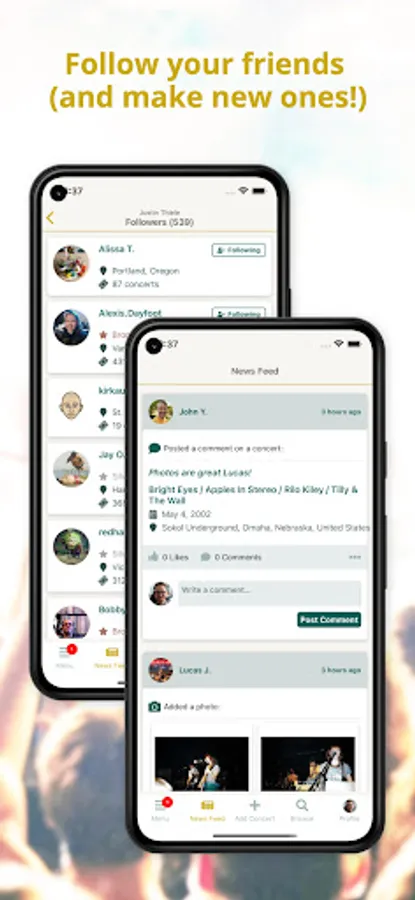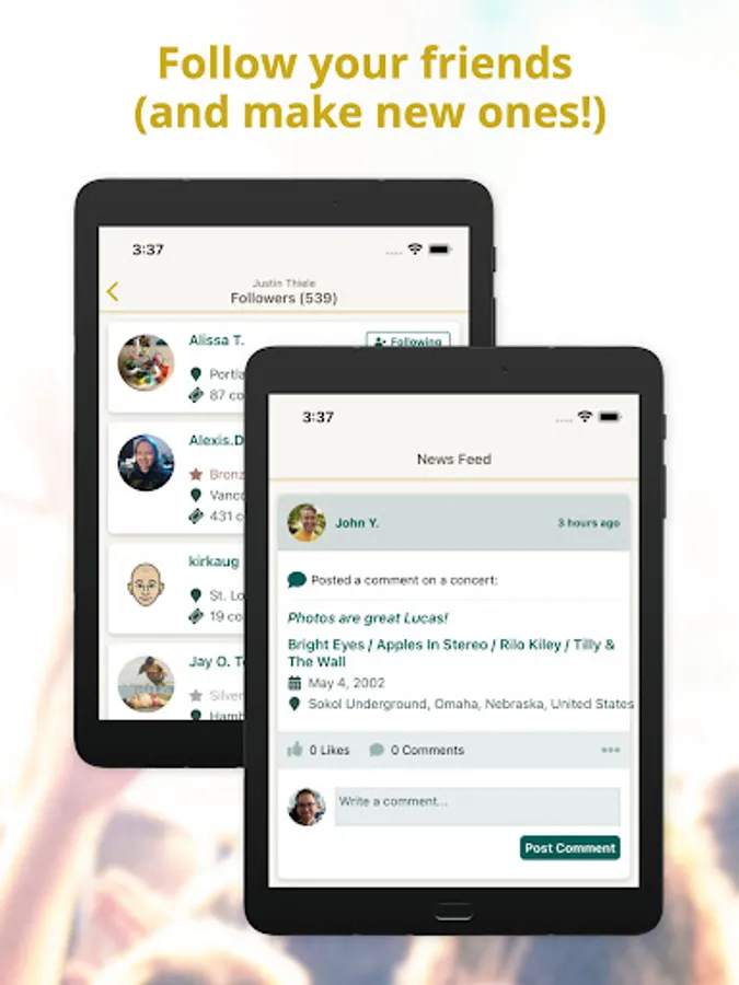 • Follow Friends (and make new ones!) See their concert history, photos/videos, favorite concerts, bucket list and more.