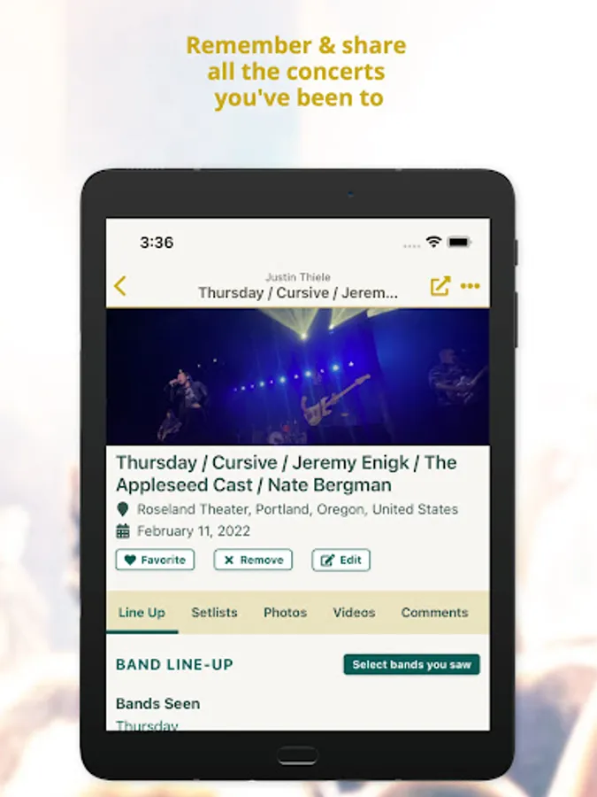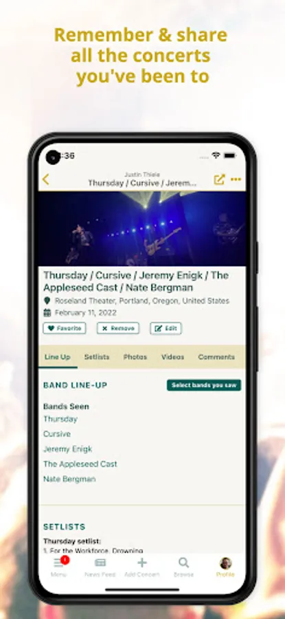 • Share The Experience: See photos & videos from other people at the concert and share your own. Even see the setlists that the bands played.