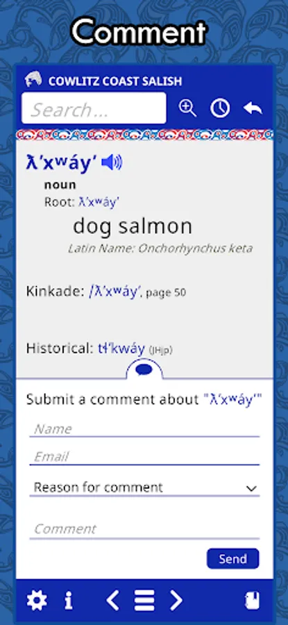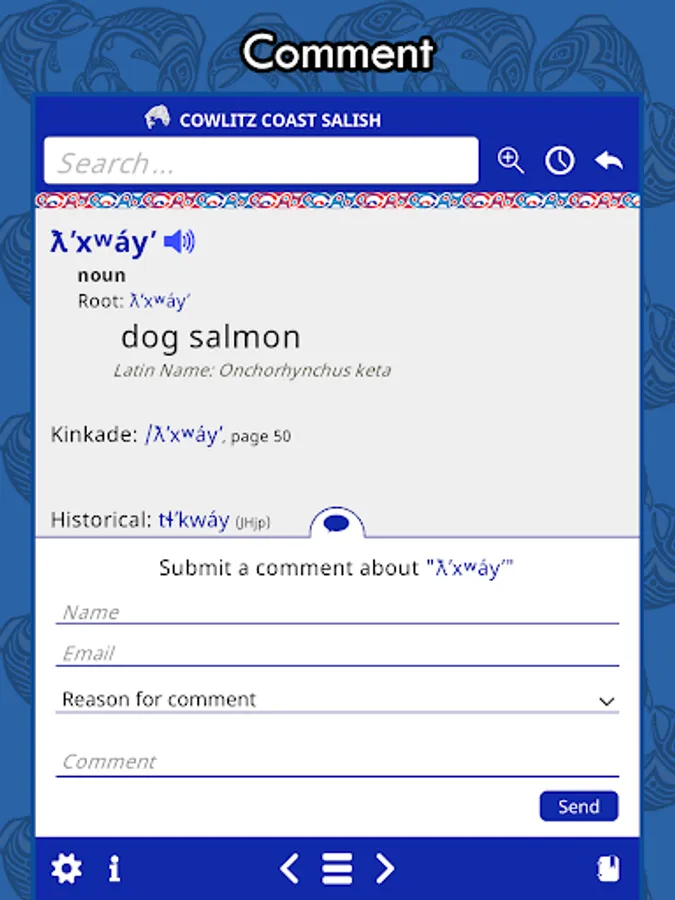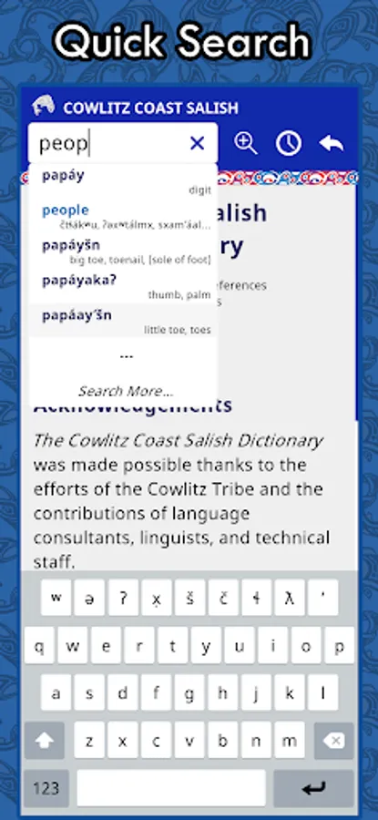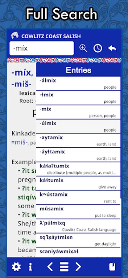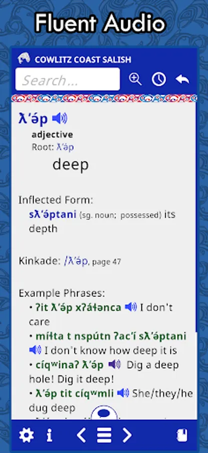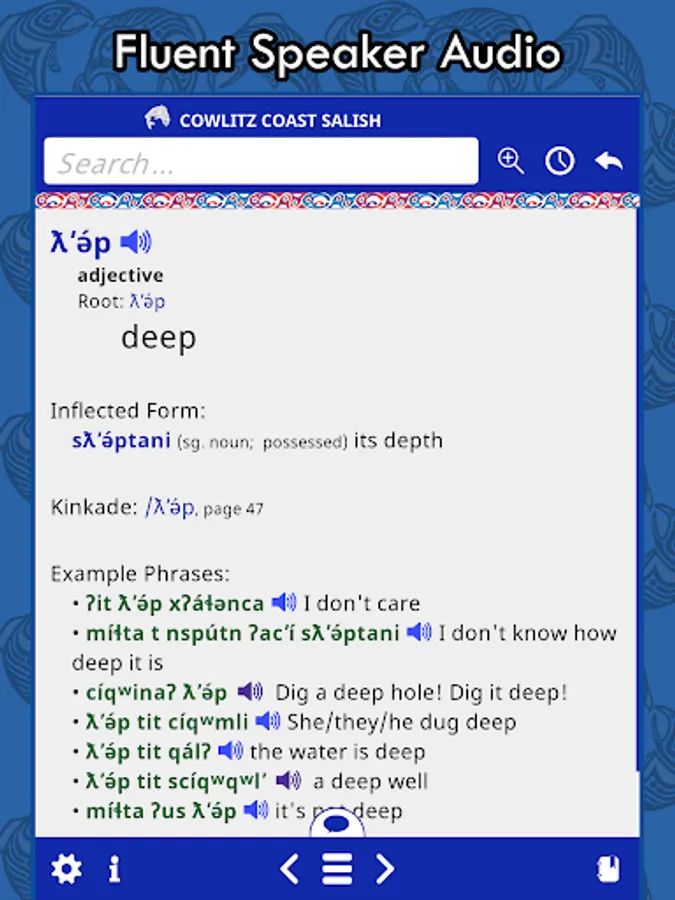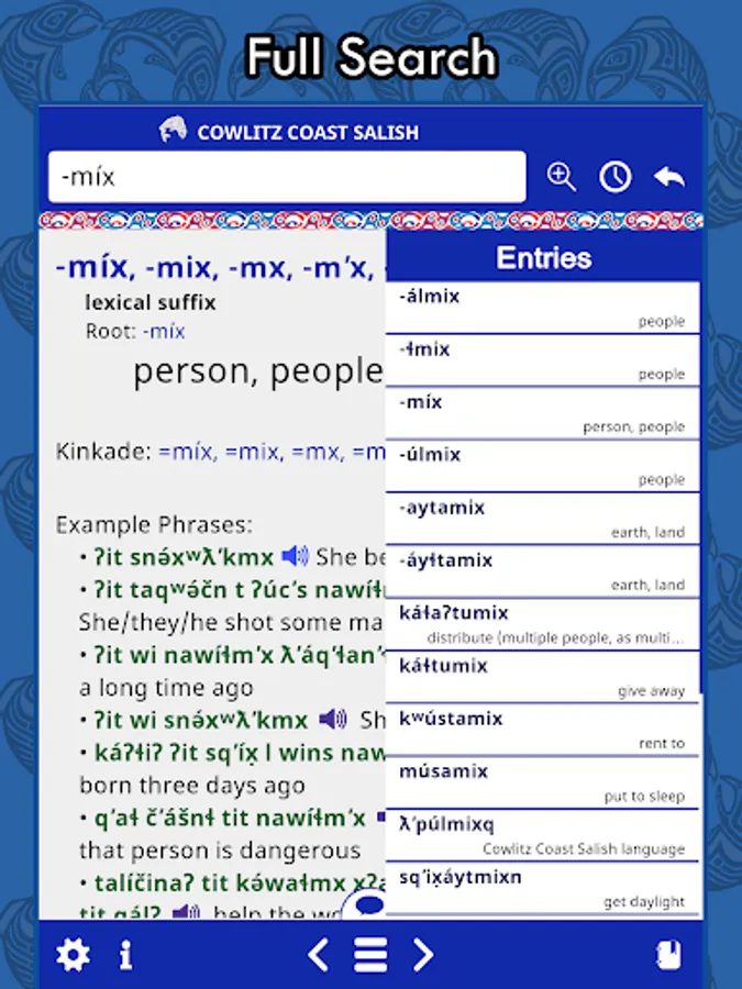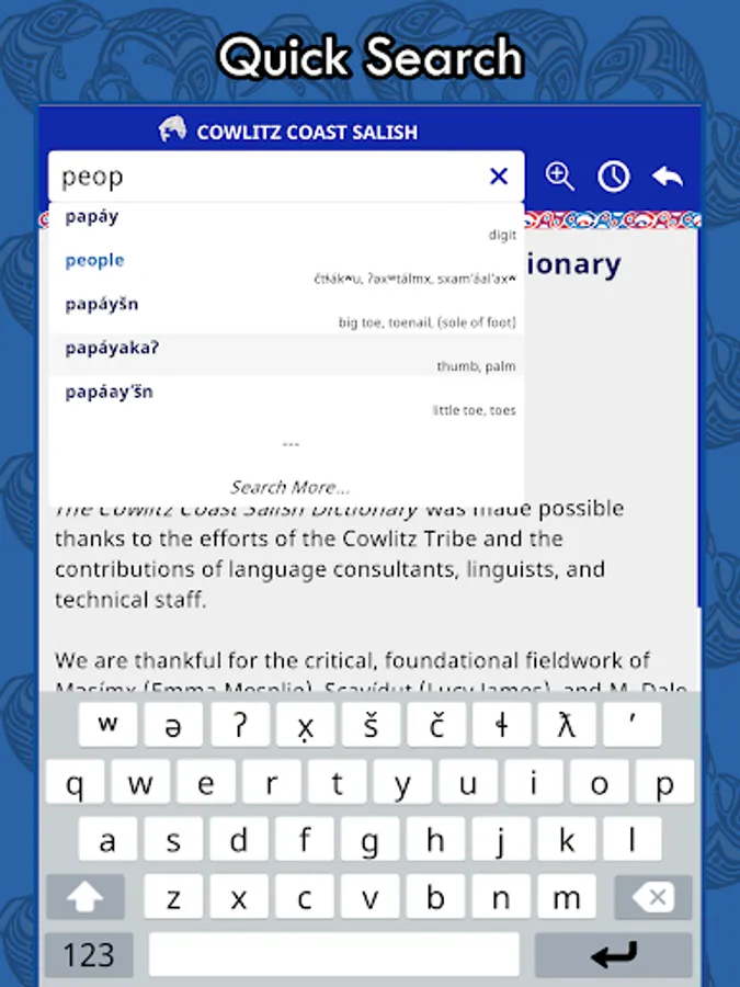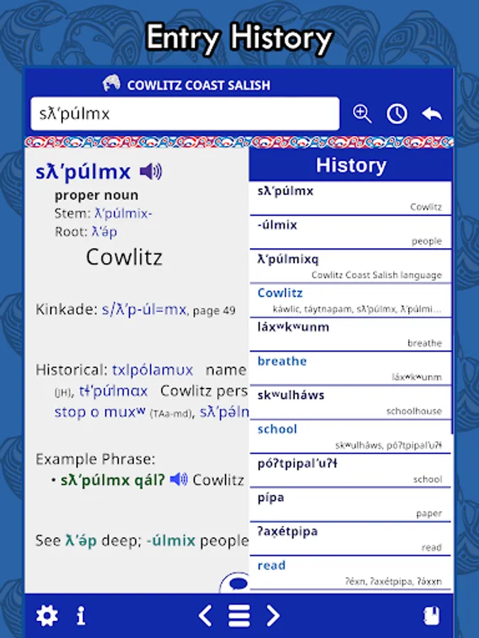 The Cowlitz Coast Salish Mobile Dictionary is the best way to look up Cowlitz Coast Salish words and hear pronunciation while on the go. It’s the ultimate electronic Cowlitz Coast Salish learning and reference tool.