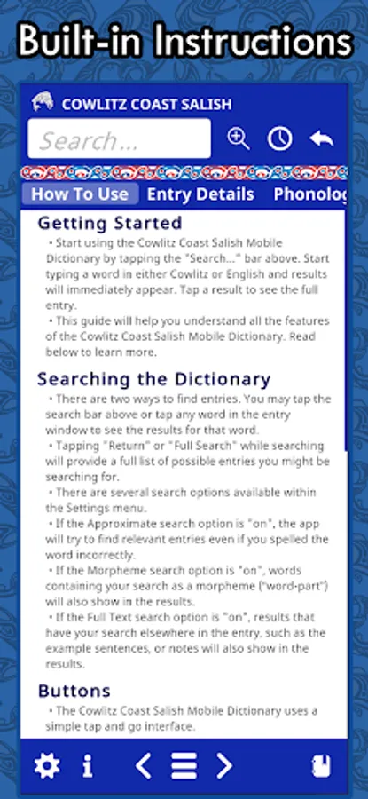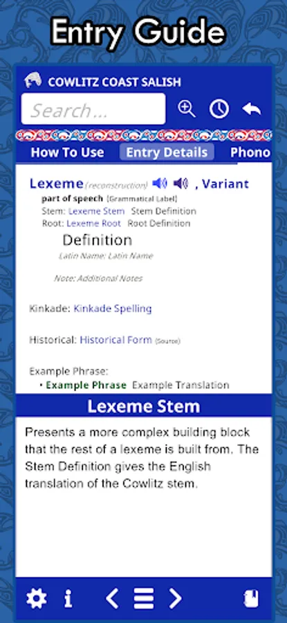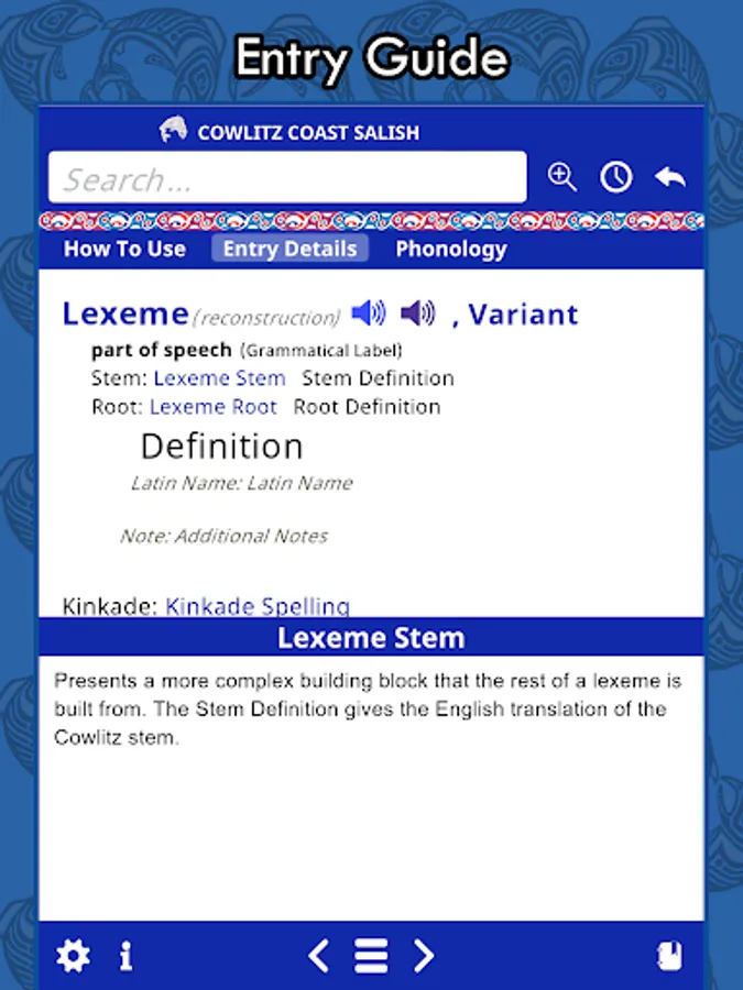 • In the information section, select a tab from the sliding bar above to learn more about "How To Use" the dictionary, "Entry Details"