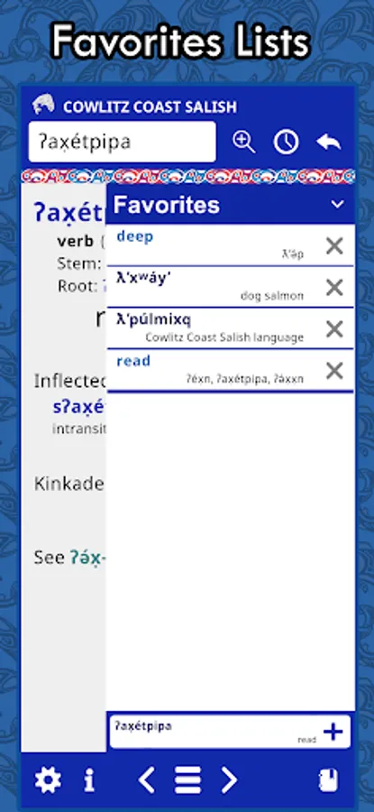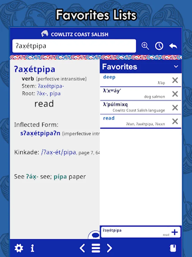 • The Favorites panel allows you to save your favorite words like a bookmark. From this panel, you can create new lists, add words to specific lists for later review, and better organize using the Cowlitz Coast Salish Mobile Dictionary as YOUR Cowlitz Coast Salish language learning tool