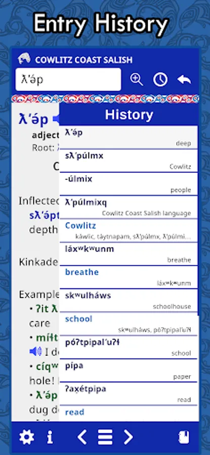 • There are two sides to the Cowlitz Coast Salish Mobile Dictionary. If you are currently viewing a Cowlitz Coast Salish word, you are on the “Cowlitz” side. The left and right buttons will take you to the next or previous Cowlitz Coast Salish word in alphabetical order. Tapping the Hamburger button will provide you with a list of the nearest alphabetical words to the entry you are currently looking at