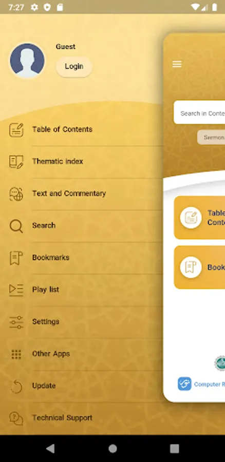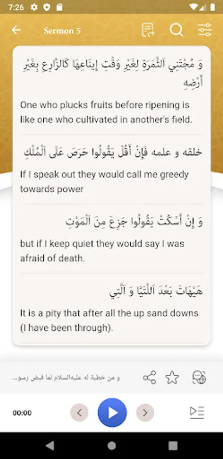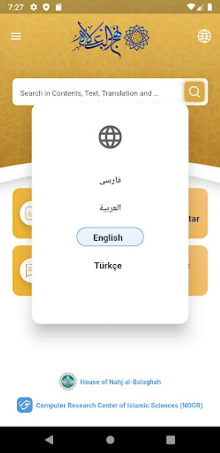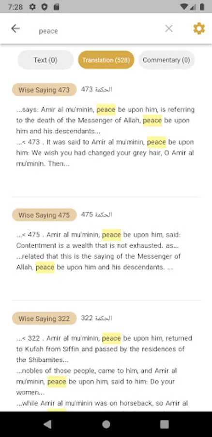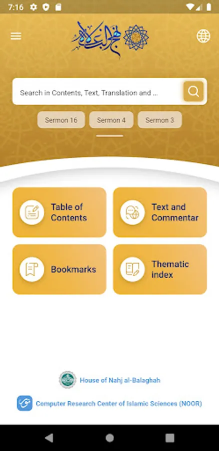 Furthermore, the users are supplied with other capabilities such as search in content, and the recitation of the original text of Nahj al-Balaghah and its translation. They can study the text, two translations and the thematic index of the app in their mobiles in offline mode.