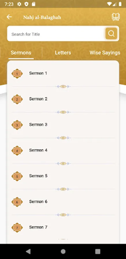 List of titles: a list of the titles of Sermons, Letters and Wise Sayings of Nahj al-Balaghah with the capability of text display, and search in the titles