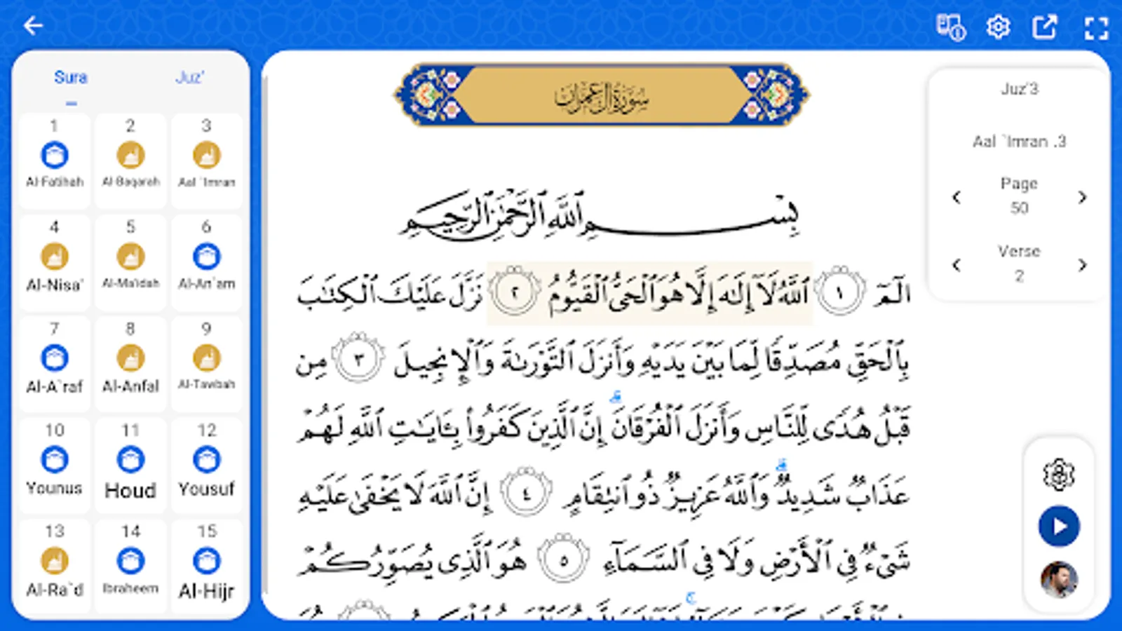 Text of the Holy Qur’an: display of the text of the Holy Qur’an, based on ‘Uthman Taha’s copy as well as the orthodox orthography, along with translation and recitation