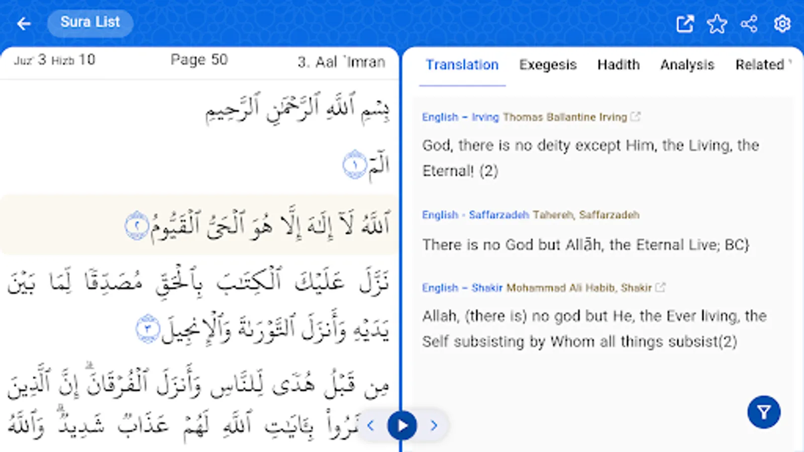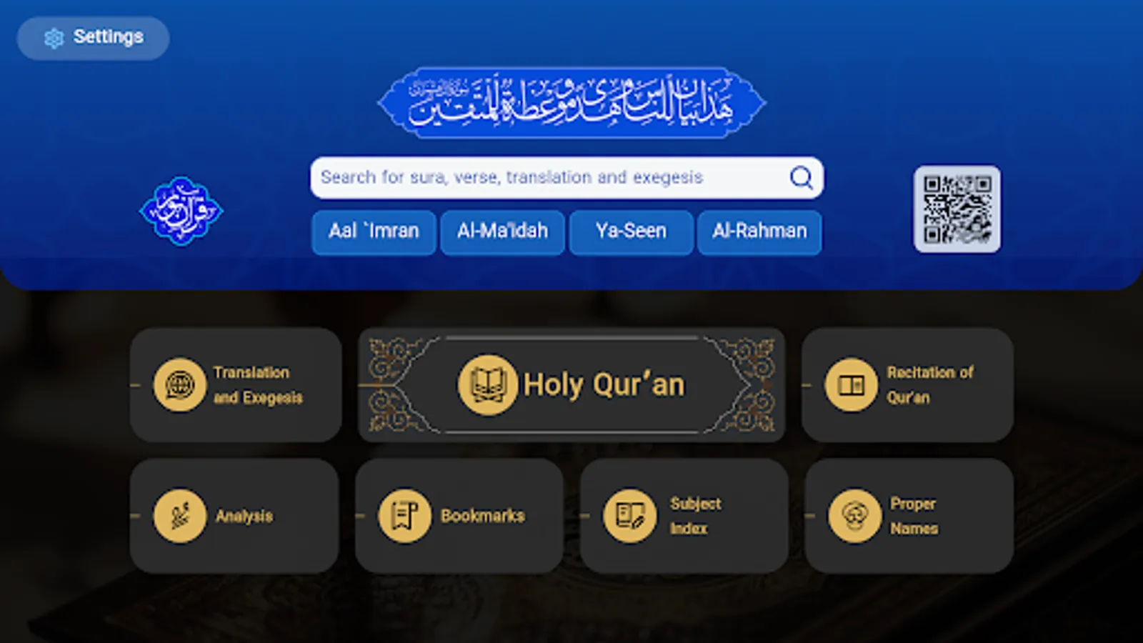 This app was designed to be used in mobile phones having the Android OS, and is at the disposal of dear users on line. Even having disconnected from the Network the users can enjoy the text of the Qur’an, two translations, two exegeses, as well as the recitation of the Qur’an offline.