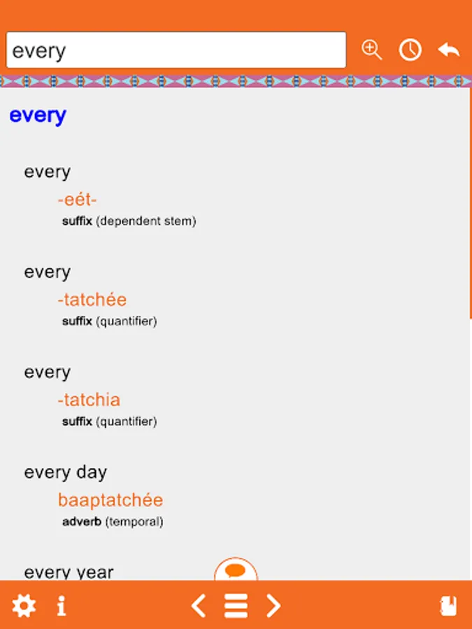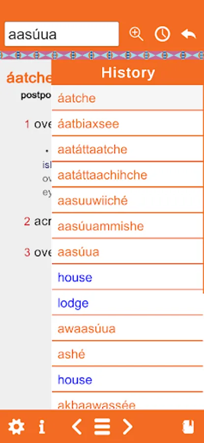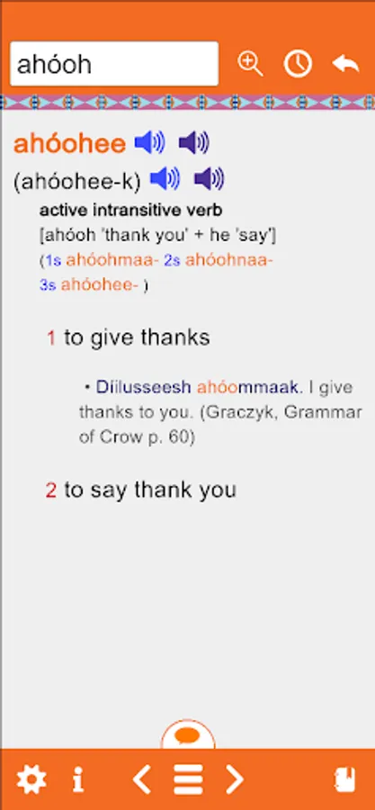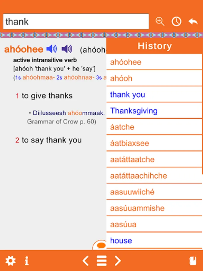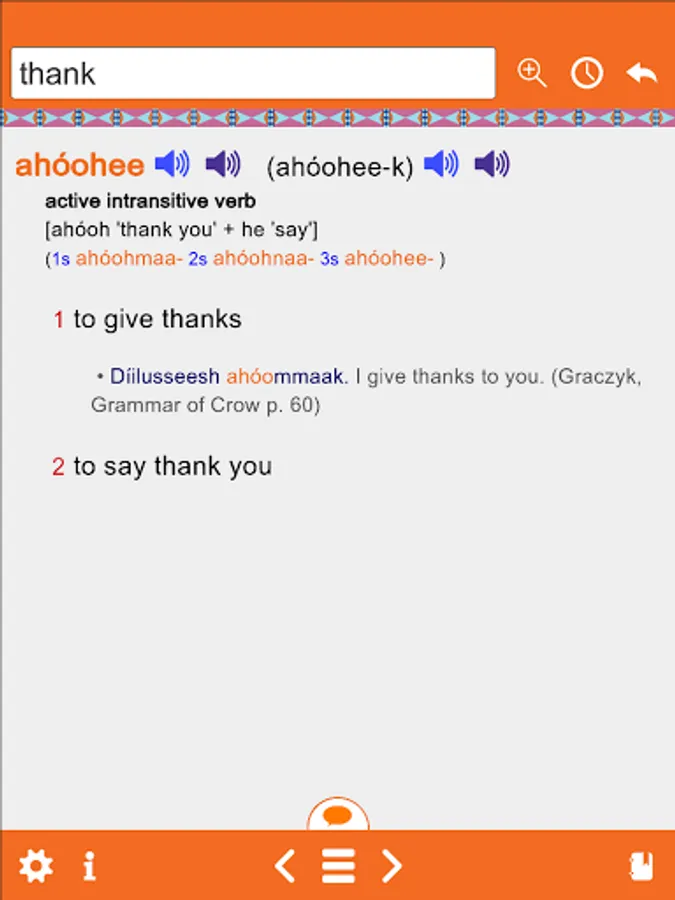 • There are two sides to the Crow Mobile Dictionary. If you are currently viewing a Crow word, you are on the “Crow” side. The left and right buttons will take you to the next or previous Crow word in alphabetical order. Tapping the Hamburger button will provide you with a list of the nearest alphabetical words to the entry you are currently looking at