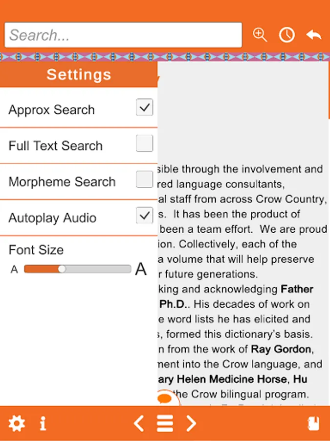 • The Settings menu allows you to refine how the search works, change the font size, and turn “AutoPlay Audio” on or off. See the “Searching the Dictionary” section for more details on the search settings