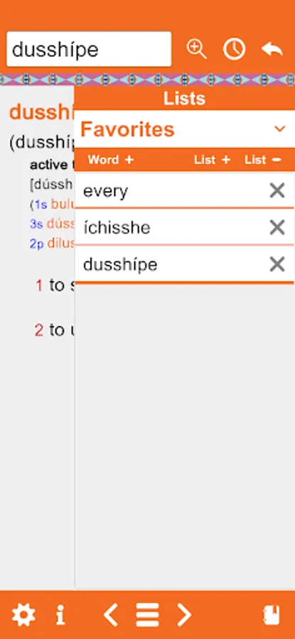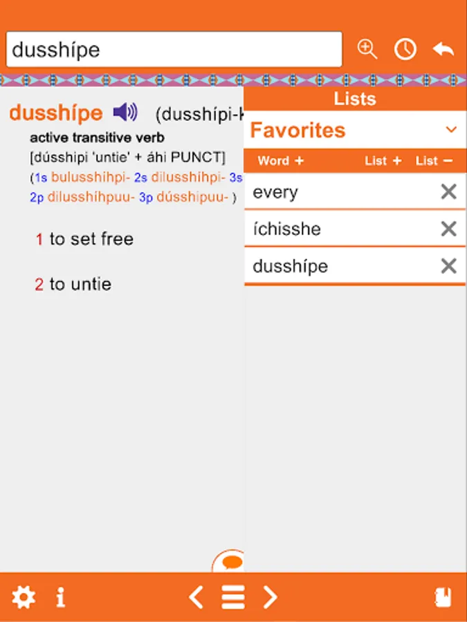 • The Favorites panel allows you to save your favorite words like a bookmark. From this panel, you can create new lists, add words to specific lists for later review, and better organize using the Crow Mobile Dictionary as YOUR Crow language learning tool