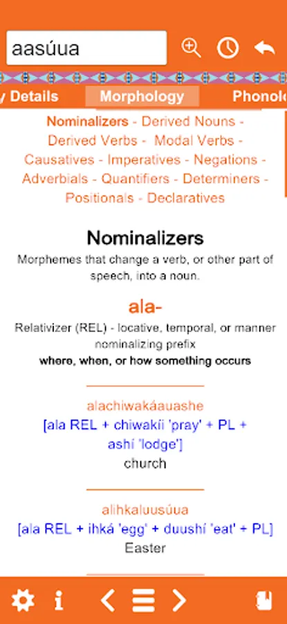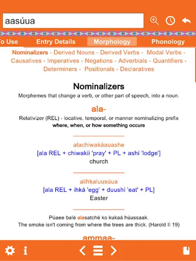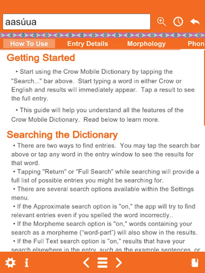 • You are currently reading the information section. Select a tab from the sliding bar above to learn more about "How To Use" the dictionary, "Entry Details", "Morphology", and "Phonology."