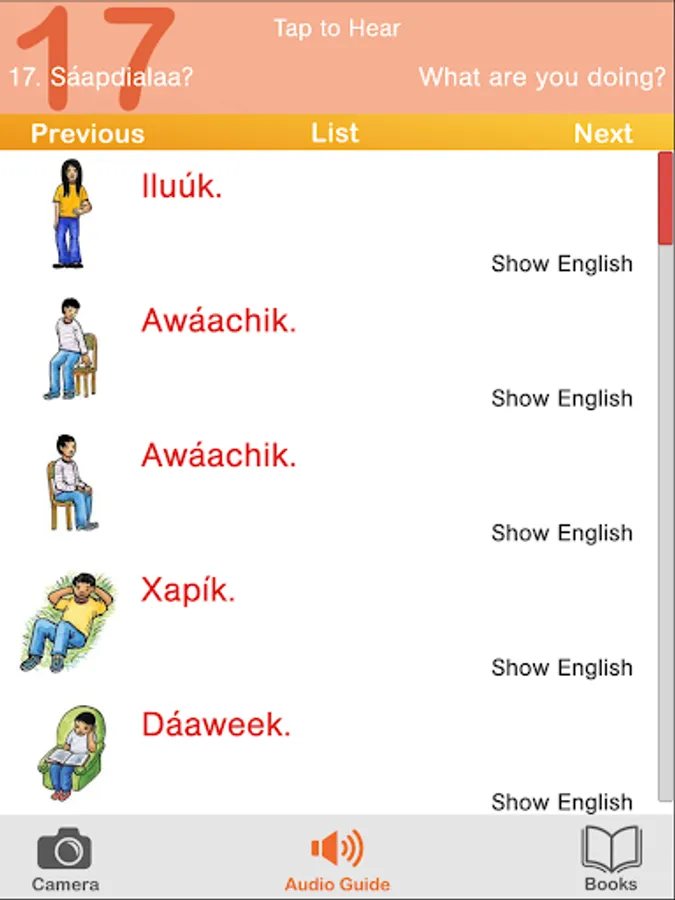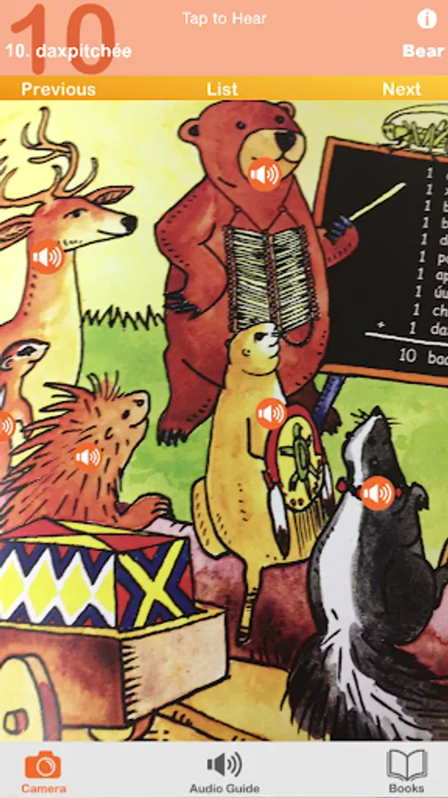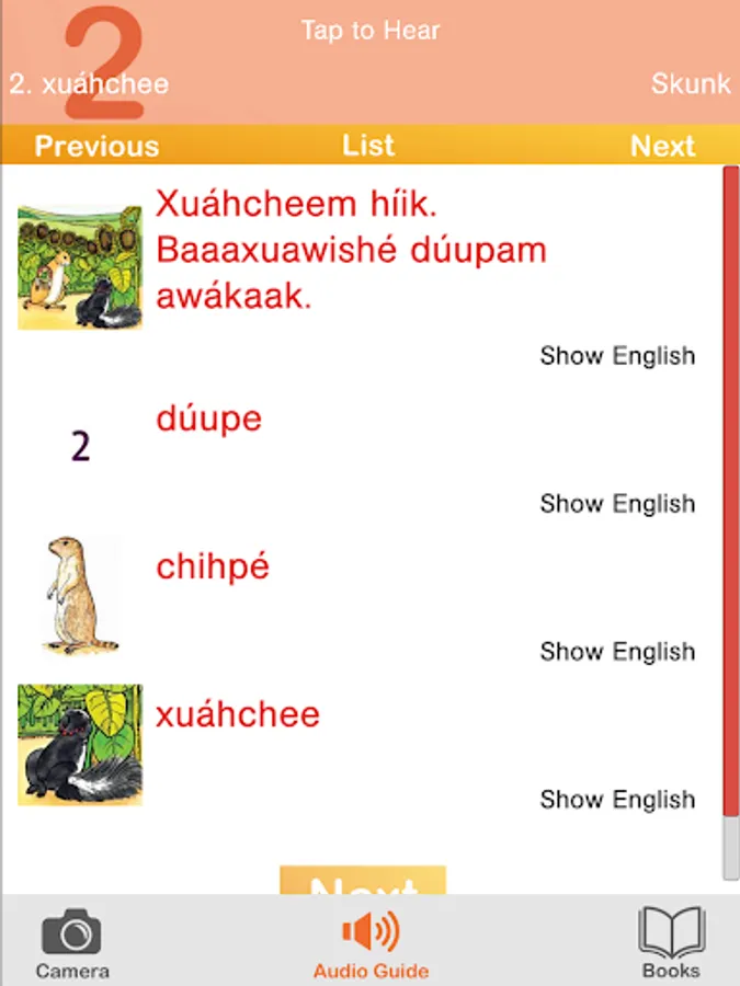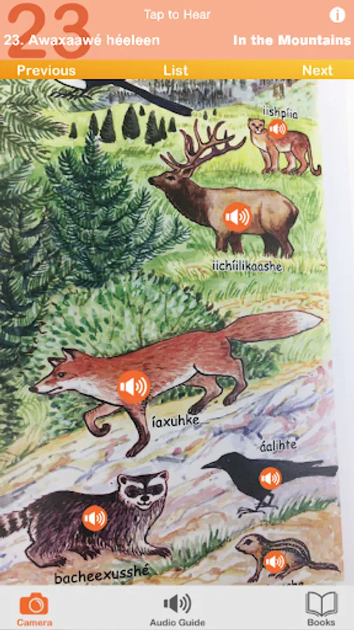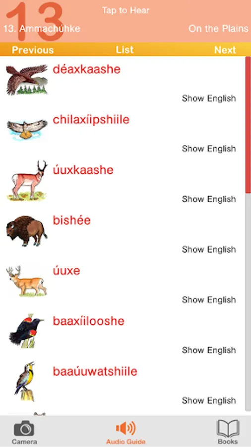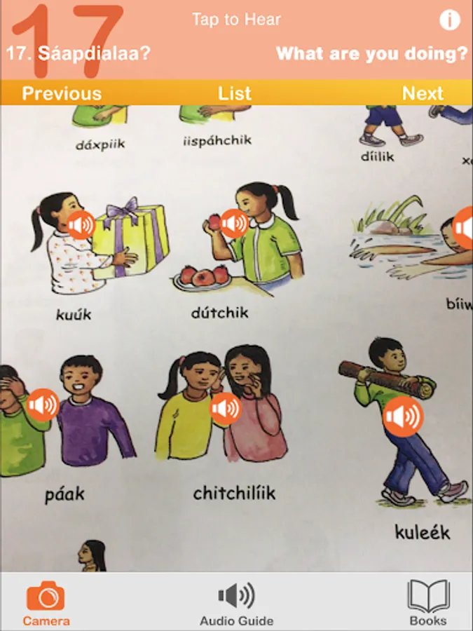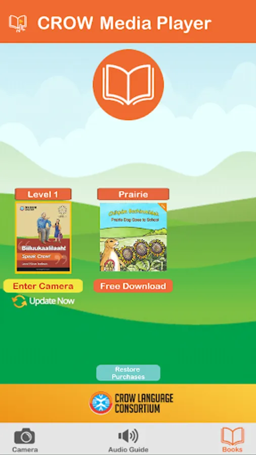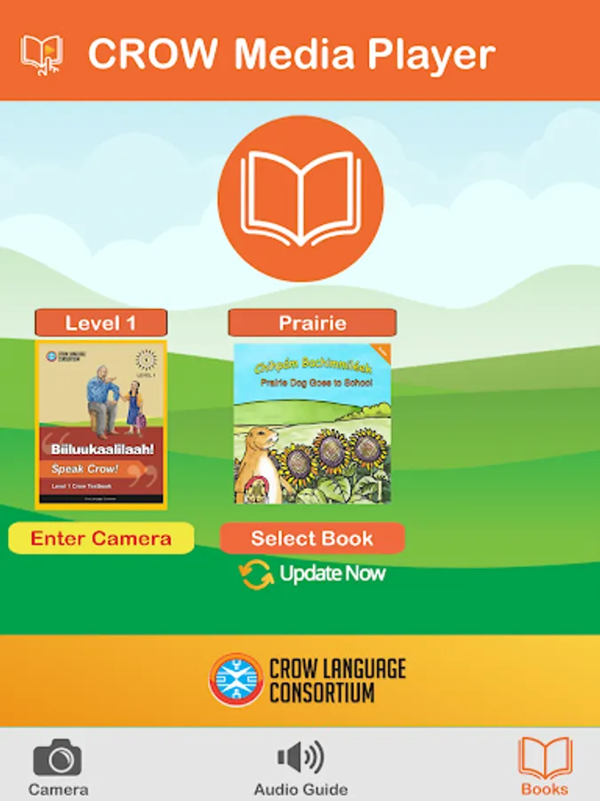 The Crow Media Player is easy to use. You’ll start out in Books, where you can select and download the content for your Crow books. The Camera mode lets you use your phone’s camera to put audio content right on the page. The Audio Guide mode has the Crow spellings, images, English translations and audio, all in one easy tap and swipe interface.