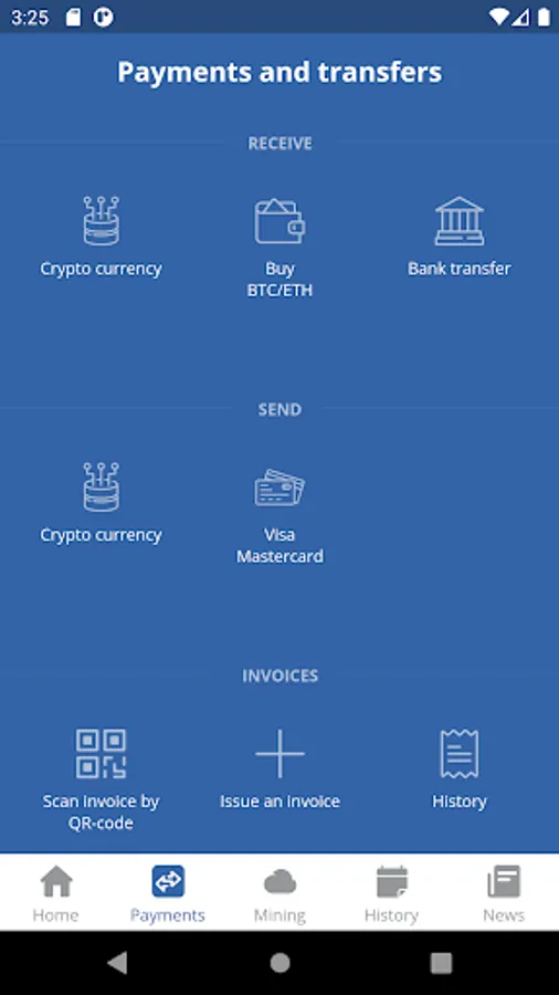 Quick access menu “Summary” contains frequently used functions – Deposit, Withdraw, Exchange, Create a card, Scan a card, Mining deposit, Issue an invoice, Scan an invoice, Support. The basic menu contains – Wallet, Cards, Cloud Mining, Invoices.